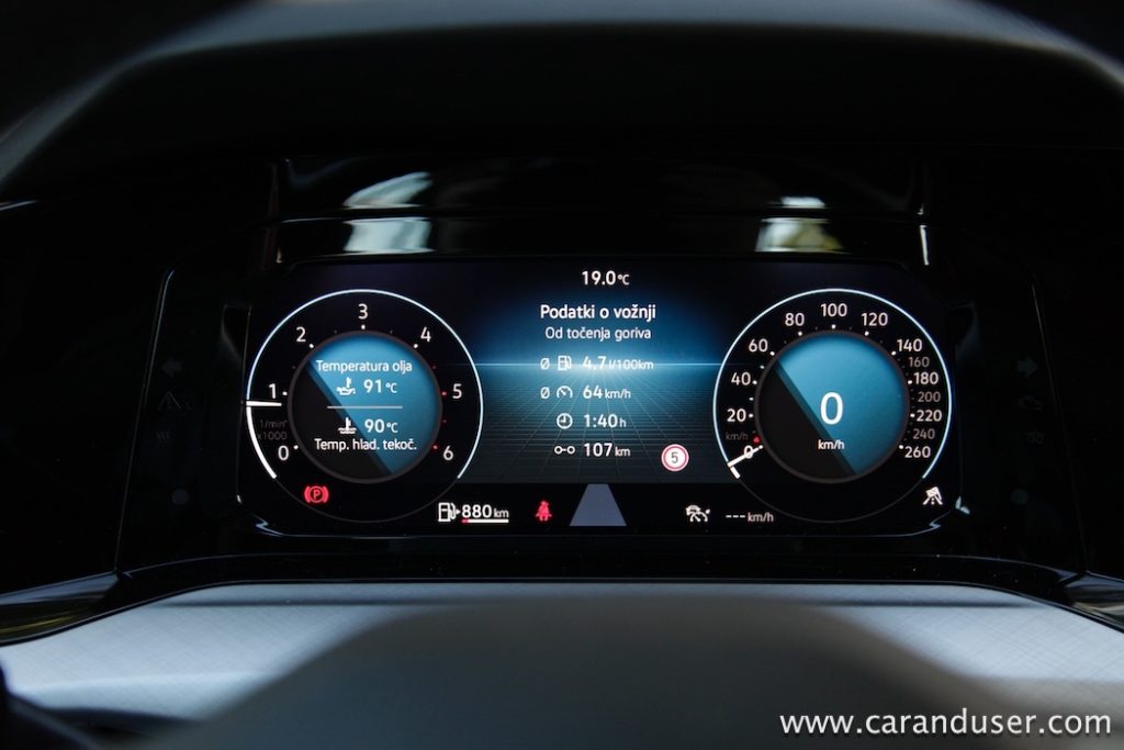 Tudi voznikova instrumentacija omogoča nekaj prilagoditve, in prikazuje vam ljube informacije – podatki o vožnji, navigacija, multimedija. Ker smo na trenutke starokopitni, smo si bili ob pregledu vsi (tudi z poglavarjevo ženo na čelu) složni, da so navidezni analogni števci še vedno najboljša rešitev.