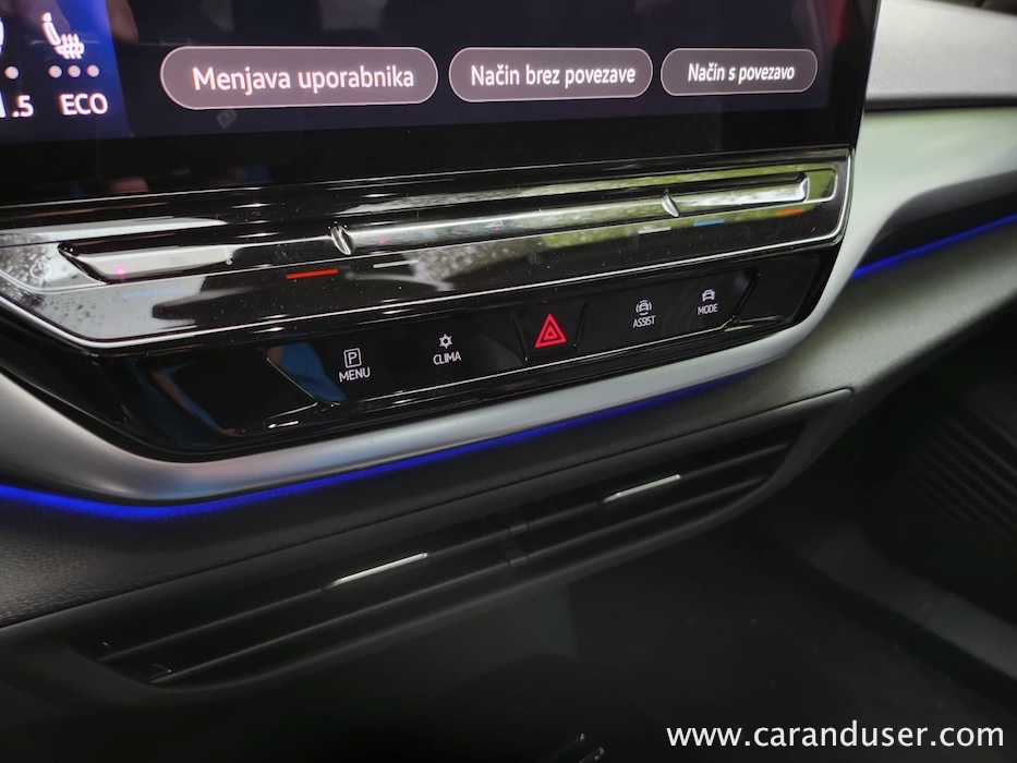 Srčika štirikolesnega električarja je tako njegov ambient. Oblazinjenje si zasluži visoko oceno, saj je prijetno na otip in udobno na daljših relacijah, hvale vredni so tudi panoramska streha in zatemnjena bočna stekla, pa recimo zvočna zatesnjenost notranjosti, nakar sledi nekaj od Enyaqa za odtenek manj prepričljivih rešitev. Začnimo pri stikalih za upravljanje. Drsniki in senzorska stikala ne delujejo vedno kot bi si voznik želel, upravljanje vsakodnevnih funkcij je često zakopano nekje v podmeniju osrednjega multimedijskega zaslona, za dodaten ščepec pelina pa poskrbijo reciklirana in ne ravno prepričljiva plastika na dnu armaturne plošče ter »kombijevska« naslonjala sedežev prve vrste. Verjamem, da bi lahko notranji oblikovalci bolje izkoristili prostor v ID.5, če ne drugega, naj gredo na »benchmark« k oblikovalcem Passata, Arteona ali Tiguana.