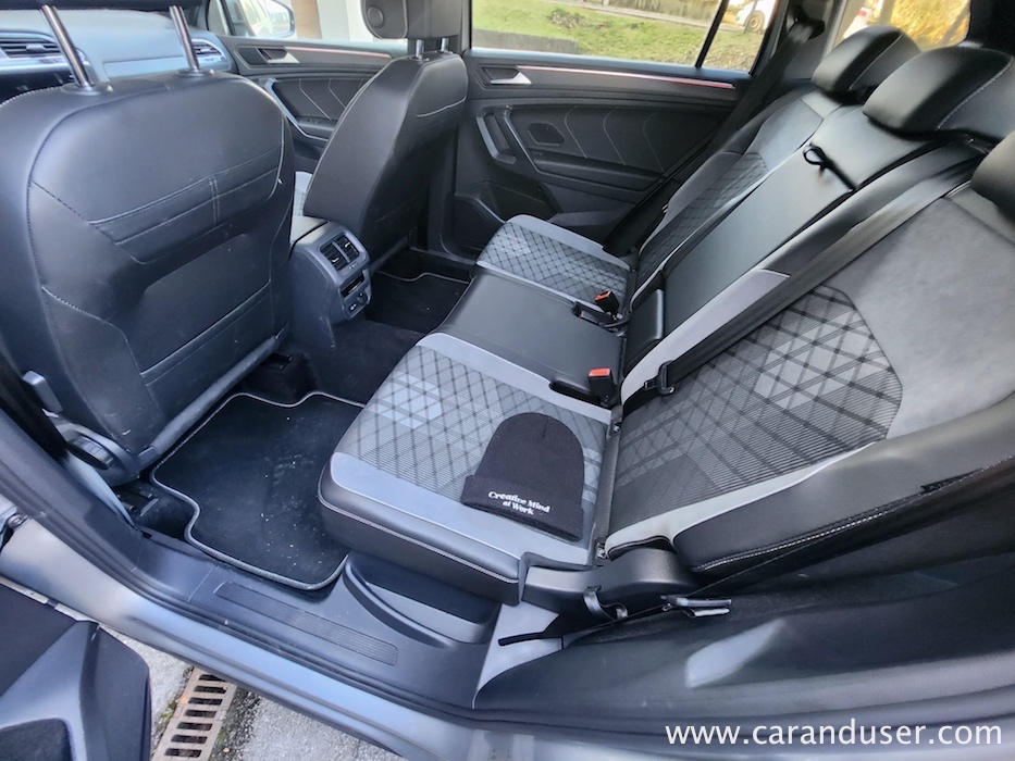 Ok, staja je bila pokrita, kaj pa sama ježa? Sedlo …? R-Line paket ne prinaša le všečnega dinamičnega videza temveč tudi nekaj športnosti in estetike znotraj družinske VW kočije kot so recimo »Carbon Grey« dekorativni elementi, stopalke iz legiranega jekla, oblazinjenje s posebno tkanino ter recimo usnjen športni volan. Kljub vsej športni estetiki se resnična bit Tiguana Allspace skriva v njegovi veličastni prostornosti. Pilot in kopilot imata lastno dnevno sobo, medtem ko se druga klop bohoti v pravcati sobani. Nalašč pretiravam, a prostora je res obilo. Čeprav bi na zadnjo klop resda lahko sedli trije osebki, bo sredinsko posedenemu malce neprijetno zaradi grebena oblazinjenja, kar na krajših poteh ne bi smelo biti moteče. Sem 760 litrov v nahrbtniku že omenil? Pravcata mobilna lopa za vso družinsko motorizirano divizijo – vozički, poganjalci, skiroji … »you name it!«. Vse se spravi v Tiguanov ruzak, pa še za kakšno reč (ali več njih) se najde mesto.