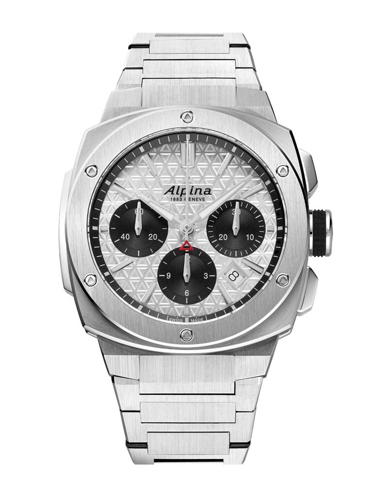 Pred kratkim smo na testu imeli model Alpiner Extreme Automatic, ki mu po oblikovnih načelih sledi nova kronografska različica. Osnovo predstavlja fasetno ohišje v obliki blazinice, s široko luneto in okrasnimi vijaki, medtem ko premer znaša 41 mm. Ker gre za kronograf, je ob krono na desni strani dodan nov par potisnih gumbov.