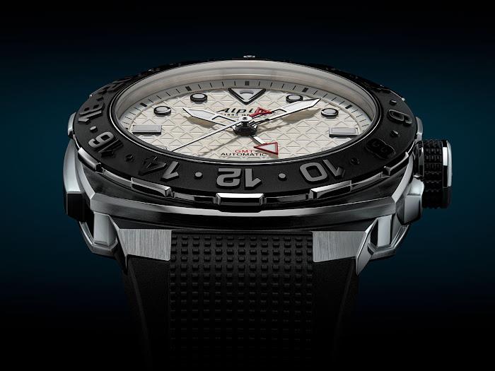 Številčnica, zaščitena s safirnim steklom proti odsevu, je teksturirana z Alpininim ikoničnim trikotnim emblemom in prekinjena z datumskim okencem ob 6. uri s črnimi številkami na belem ozadju. Osrednji, ročno brušeni kazalci, ki označujejo čas, so združeni s četrtim kazalcem z rdečo puščico, ki se uporablja za funkcijo GMT. Slednjega se upravlja preko krone ob 3. uri.