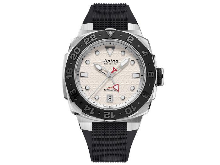 Številčnica, zaščitena s safirnim steklom proti odsevu, je teksturirana z Alpininim ikoničnim trikotnim emblemom in prekinjena z datumskim okencem ob 6. uri s črnimi številkami na belem ozadju. Osrednji, ročno brušeni kazalci, ki označujejo čas, so združeni s četrtim kazalcem z rdečo puščico, ki se uporablja za funkcijo GMT. Slednjega se upravlja preko krone ob 3. uri.