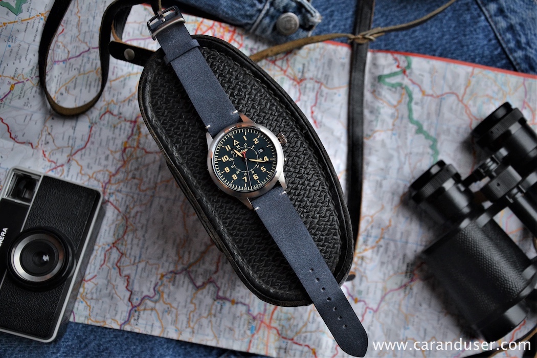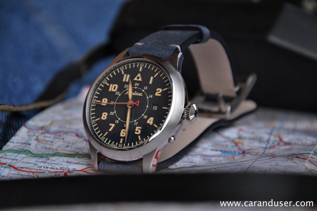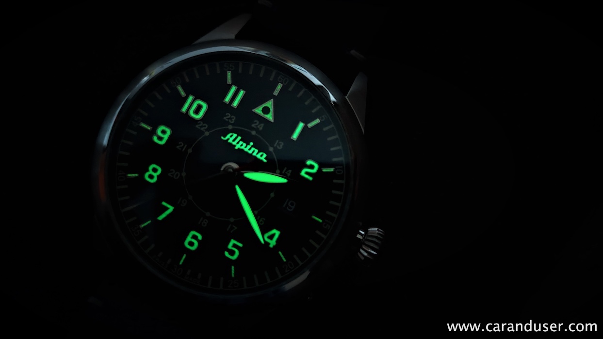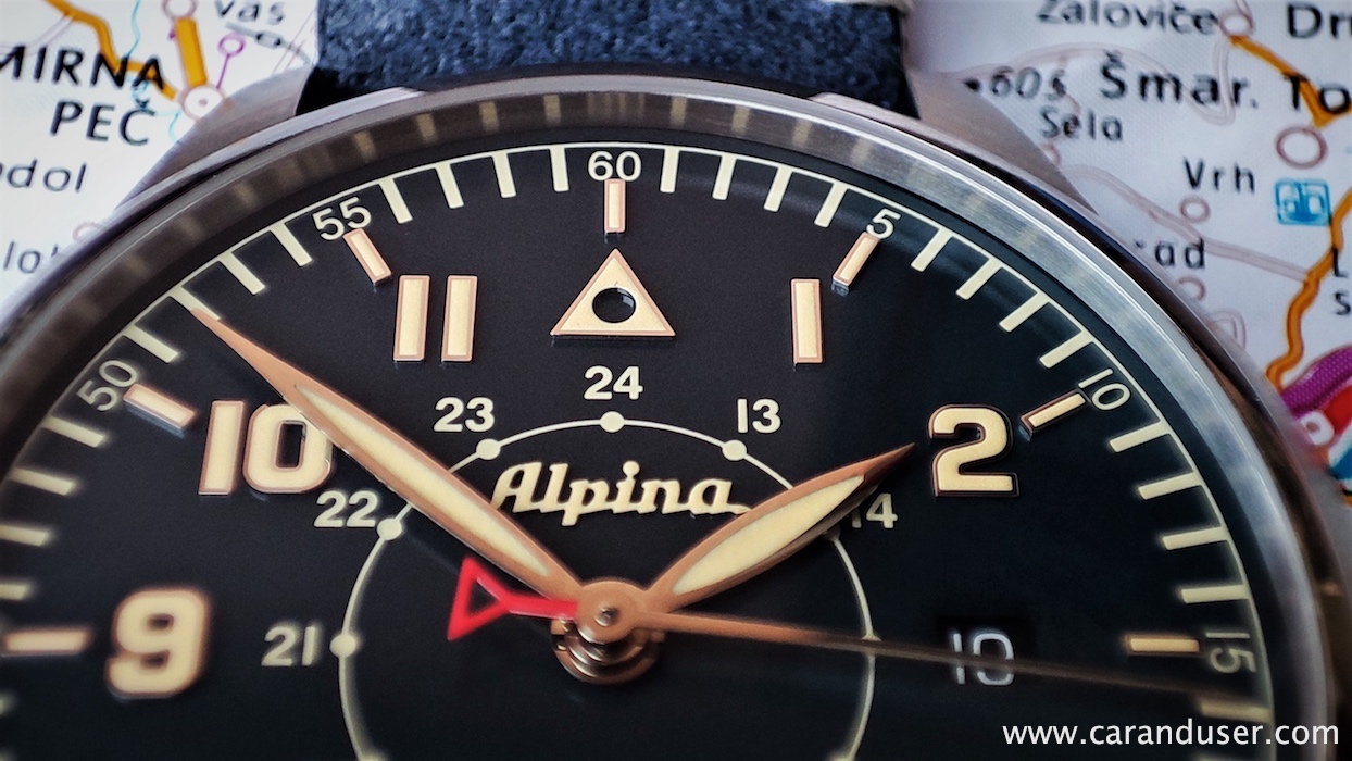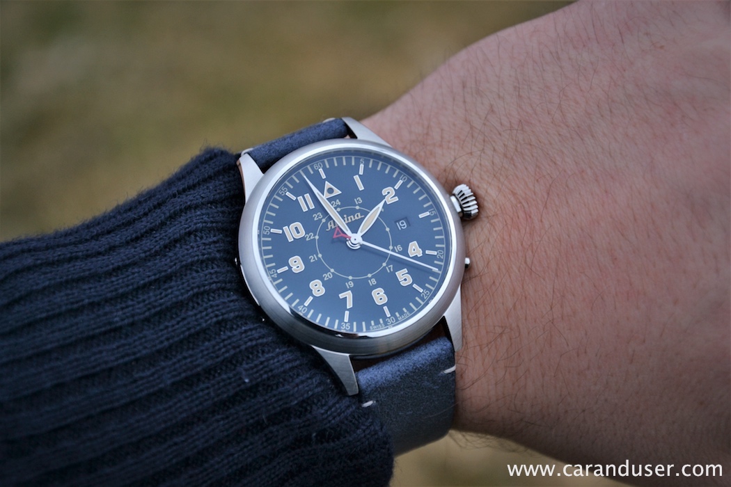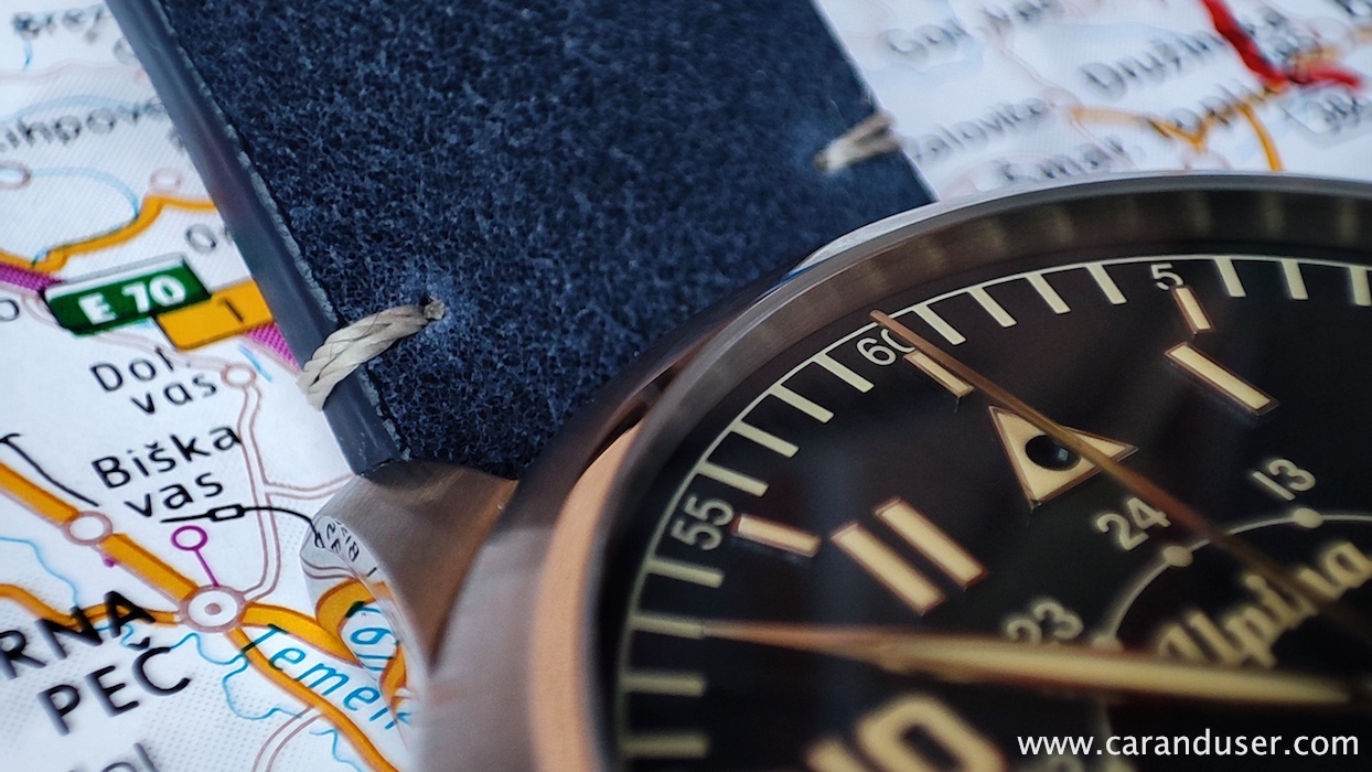 Sicer pa, ali veste po čem se prepozna pilotsko uro? Največkrat je to trikotnik na mestu 12. ure. Potem si sledijo še tipične arabske številke v zaporedju od 1-12 ali 05-55. Pogosto se na številčnici pojavi tudi kakšen rdeč ”pointer” detajl, ekskluzivno v obliki letala, ali pa navijalna krona v obliki čebule. Slednja je sila dominantna na modelu Startimer Heritage Automatic Limited Edition. Z njo se upravlja čas, datum in navijanje mehanizma. A z markantnostjo najbolj izstopa modra številčnica, ki je med večtedensko nošnjo požela številne poglede in pohvale. Vsebuje vse omenjene atribute ”flieger” ur, ki jih še dodatno začini z arabskimi indikatorji ur v vintage bež barvi. Svoje pristavijo še enako obarvani kazalci ter sekundni kazalec z rdečim trikotnikom, zaščitnim znakom blagovne znamke Alpina.