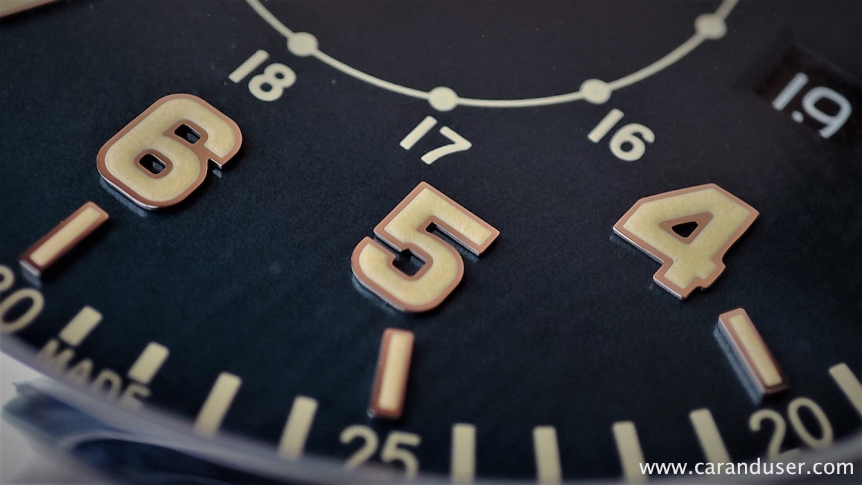 Ob 3. uri se nahaja prikazno okence s funkcijo datuma, sredino dopolnjuje 24-urna skala, dočim pa se robu številčnice prilega 60-minutna skala. Končna obdelava številčnice je odlična, o čemer se lahko prepričate v galeriji, s super makro posnetki. V bistvu celotna podoba ura deluje sorazmerno in skladno.