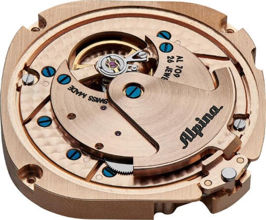 Kot že omenjeno na začetku, Alpini Startimer Pilot Heritage Manufacture poganja hišni avtomatski mehanizem, kaliber AL-709, ki ponuja 38 ur rezerve energije navitja. Njegova nihajoča utež je v celoti vidna skozi safirno hrbtno stran in predstavlja ikonično model s to razliko, da se zdaj utež odbija v odklonu 330°.