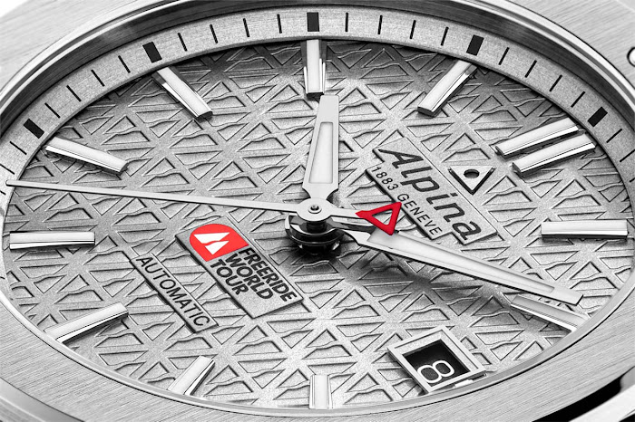 Siva številčnica odraža kamnite teksture ikončnih alpskih vrhov, medtem ko na posebno izdajo nakazuje logotipom Freeride World Tour ob 6. uri. Kazalca za ure in minute sta brušena, ter tako kot indikatorji ur, napolnjena s Super-LumiNovo. Še en oblikovalski bonbonček je protiutež osrednjega sekundega kazalca – rdeč Alpinin kultni logotip trikotnika, ki je poklon alpskim vrhovom.