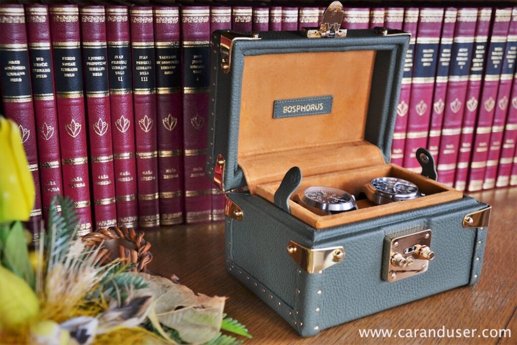 Med brskanjem spletnih mest ponudnikov urarskih dodatkov sem naletel na všečen produkt, vendar si nekako nisem predstavljal, kje bi ta lahko našel mesto v mojem življenju. Usnjena škatla turškega proizvajalca Bosphorus Leather me je nemudoma prevzela z eminentnim kontrastom kaki zelene ter peščeno rjave, ki ga dopolnjujejo pozlačeni okrasni elementi. Ampak, zakaj imeti škatlo v škatli in čemu le dva prostorčka?