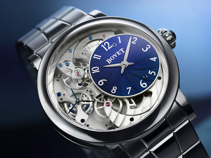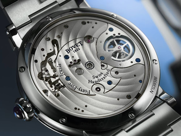 Poleg tega je zapestnica elegantno združena z ohišjem dimenzij 40 mm x 9,8 mm, izdelanim iz poliranega titana stopnje 5. Lahek in močan material je idealen za ure, saj je zelo odporen proti koroziji, praskam in je hipoalergen. Natančneje, Bovet uporablja titan stopnje 5, zlitino, ki vsebuje 90 % titana, 6 % aluminija in 4 % vanadija, kar omogoča izboljšano končno obdelavo v primerjavi s titanom stopnje 2.