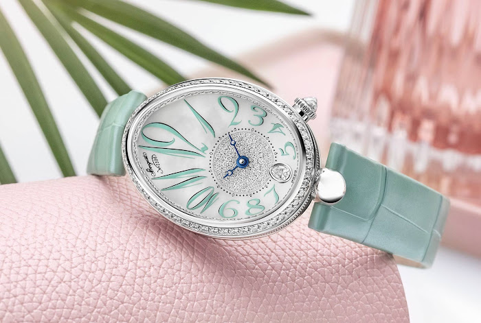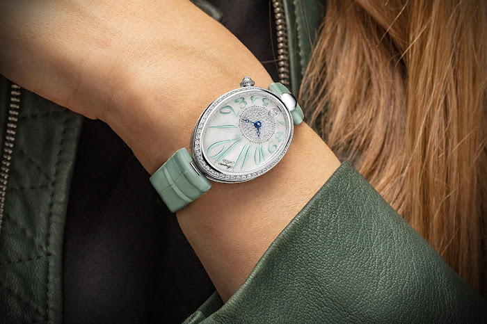 Po roza, črno-belih interpretacijah linija pozdravlja Reine de Naples 8918 Mint Green, novo elegantno in svežo različico z belo biserno številčnico z arabskimi številkami v dveh odtenkih zelene, pri katerih še vedno izstopajo ikonični Breguetovi kazalci z odprto konico, medtem ko hruškast diamant ob 6. uri doda dragocenost celotnemu časomeru.