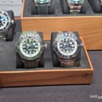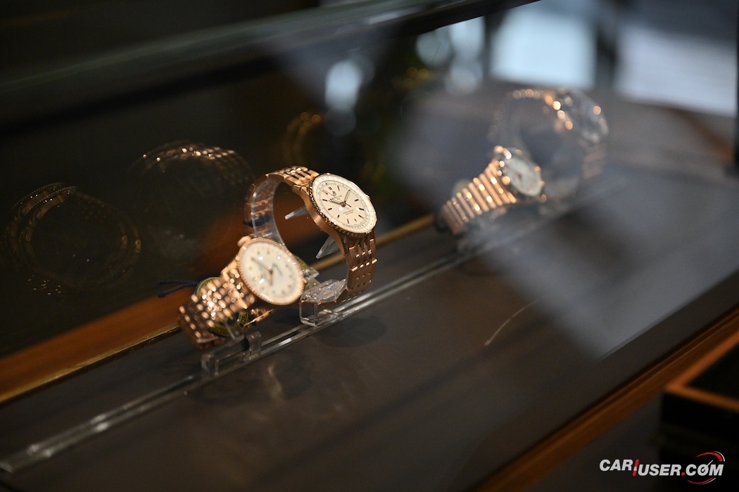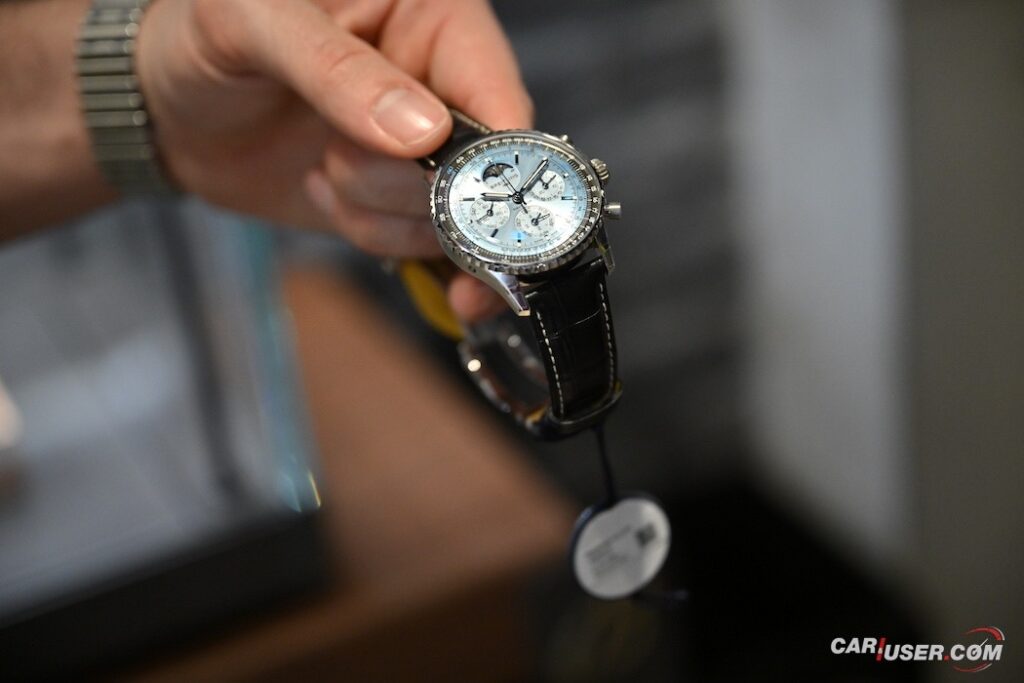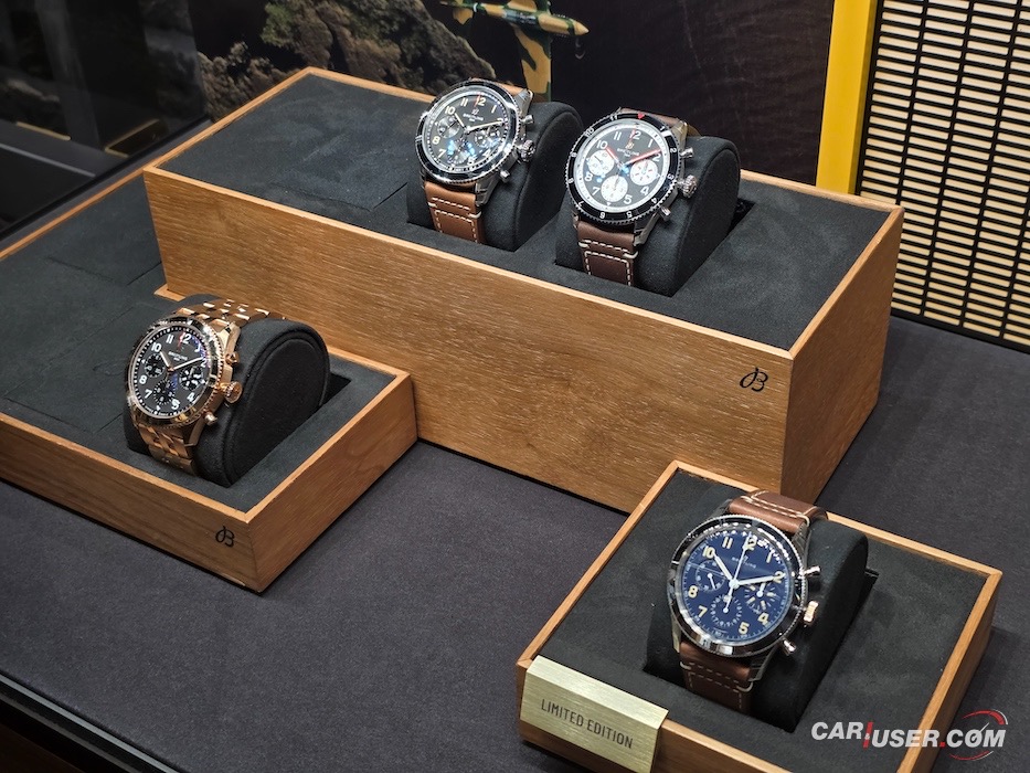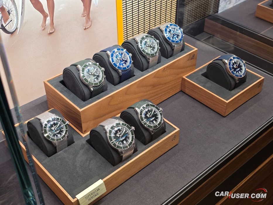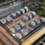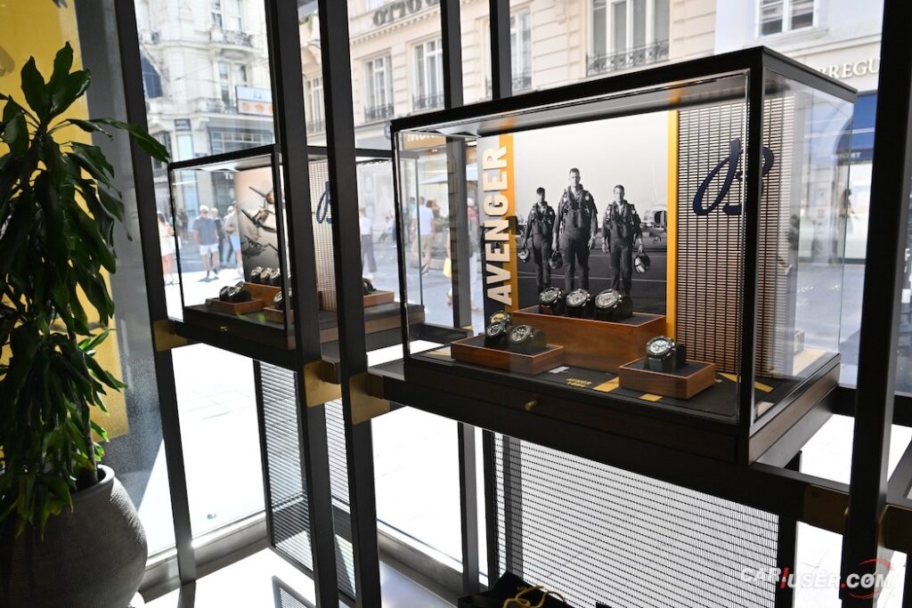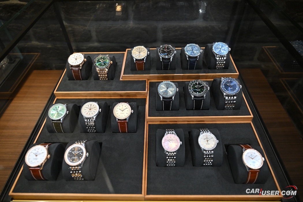 Na stenah ne manjkajo fotografije ustanovnih članov blagovne znamke, kot tudi ne ambasadorjev – športnikov, filmskih igralcev, pevcev … Prostor se najde tudi za drese – Stefan Kraft, kot lokalni ambasador, je doniral svojega skakalnega … In če smo že pri Breitlingu, ali pozante vse kolekcije? Gremo po vrsti: Classic AVI, Navitimer, Avenger, Premier, Top Time, Chronomat, Superocean Heritage, Superocean in Professional. Prav vse so zastopane v dunajskem butiku.