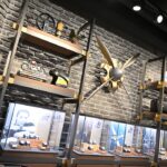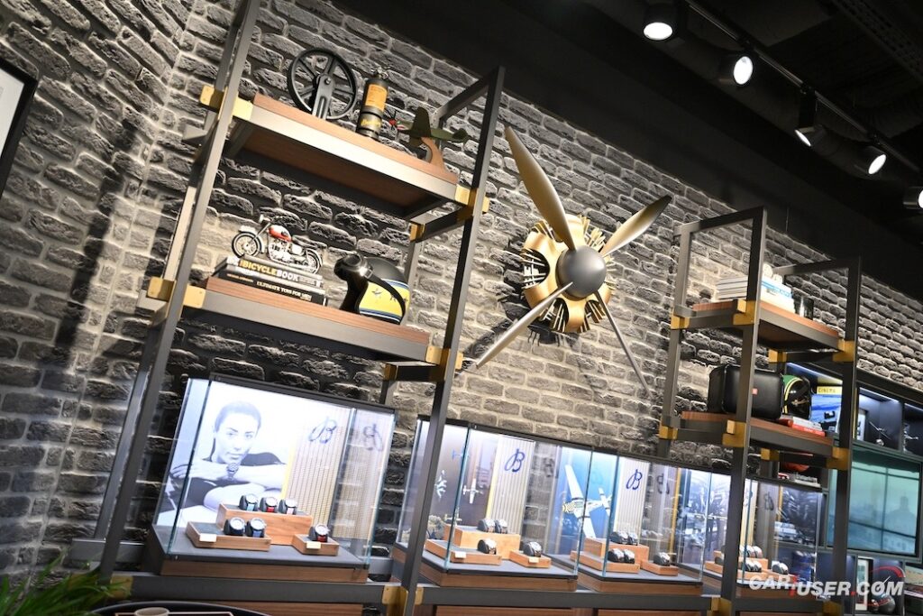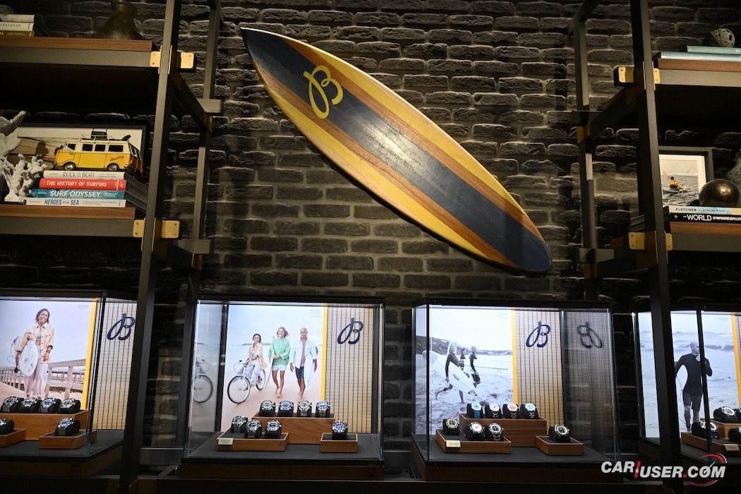 Kljub majhni kvadraturi butika, so snovalci uspeli celostno integrirati linijo švicarske manufakture – Air, Land, Sea in Space. Posledično se boste sprehodili mimo čudovite deske za surf, na steni ogledali velik propeler z delom motorja letala in se slinili ob maketah letal ter avtomobilov. Sledji so v nekaterih butikih resda v merilu 1:1, in dotični delujejo kot garaže zvezdnikov, a tudi miniaturni aspekt je po svoje simpatičen.