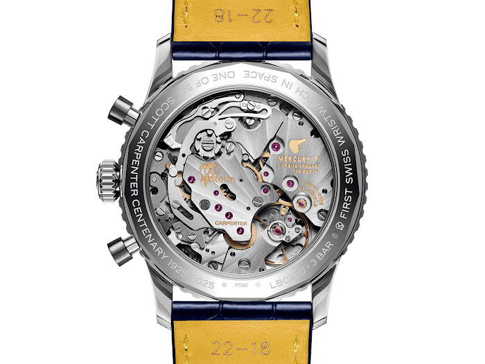 Mehanizem se možno občudovati skozi zadnjo stran ohišja prekritega s safirnim steklom. Gravure na mostičku mehanizma častijo Carpenterja z napisi „Carpenter“, njegova kapsula „Aurora 7“, „3 obhodi okoli Zemlje“ in „Mercury 7“, ime prve skupine astronavtov NASA. Dodatni napisi na hrbtni strani ohišja so „Prva švicarska ročna ura v vesolju“, „Ena od 50“ in „Scott Carpenter Centenary 1925-2025“.