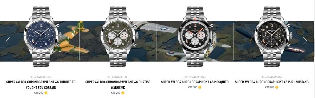 Kolekcija Breitling Super AVI v različnih konfiguracijah paščkov oziroma zapestnic je na ogled v butiku Slowatch 1991 na Čopovi ulici v Ljubljani. Cena različic Vought F4U Corsair, Curtiss Warhawk in P-51 Mustang s kovinsko zapestnico znaša 10.200 evrov. 100 evrov več se ceni verzija Mosquito.