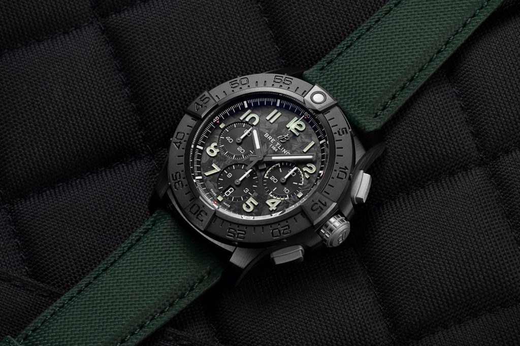Breitling Super Avenger B01 Chronograph 46 Night Mission je največja ura v kolekciji s premerom ohišja kar 46 mm, ki ga za nameček sestavljajo kar trije petični materiali.