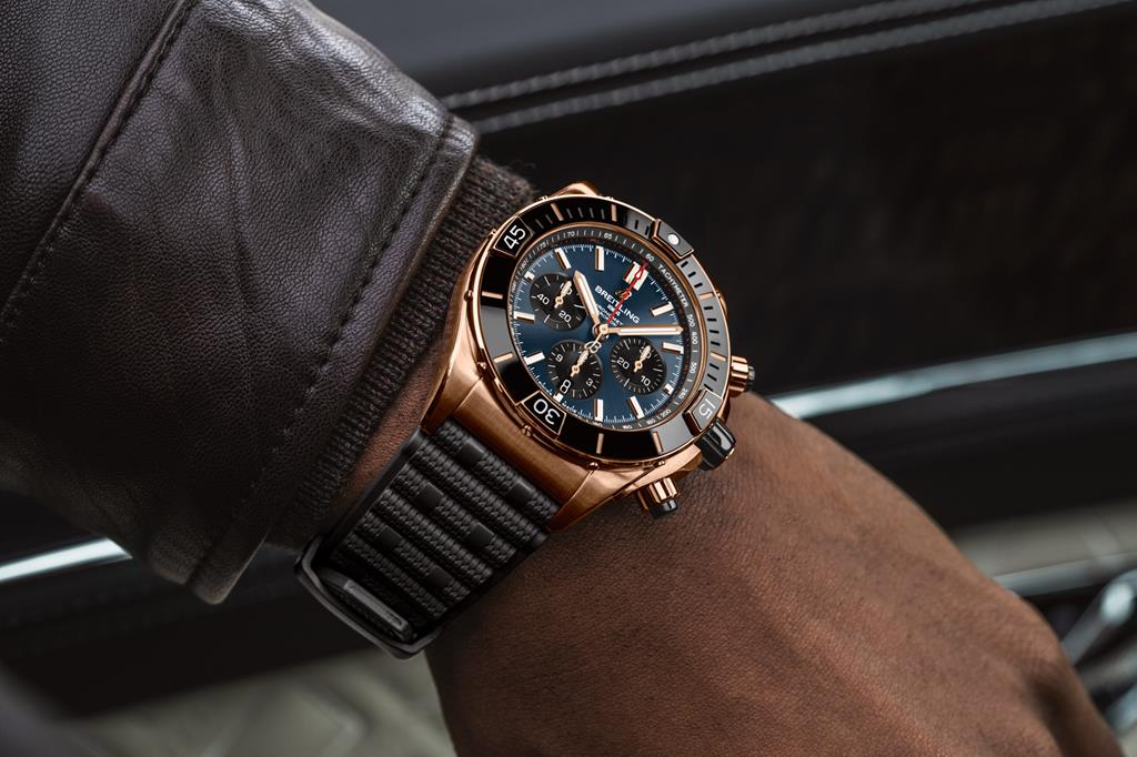 Super Chronomat, izdelan iz 18-karatnega rdečega zlata, ni lahka športna ura. Na ujemajoči se zapestnici Rouleaux tehta 330 gramov (samo ohiše 100 gramov), zato ne boste pozabili, da je ura na vašem zapestju. Če masa ni dovolj velik pokazatelj veličine časomera, potem 44 mm široko ter 14,4 mm debelo ohišje zagotovo je.