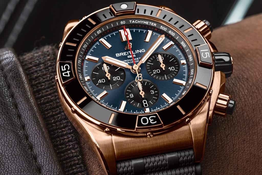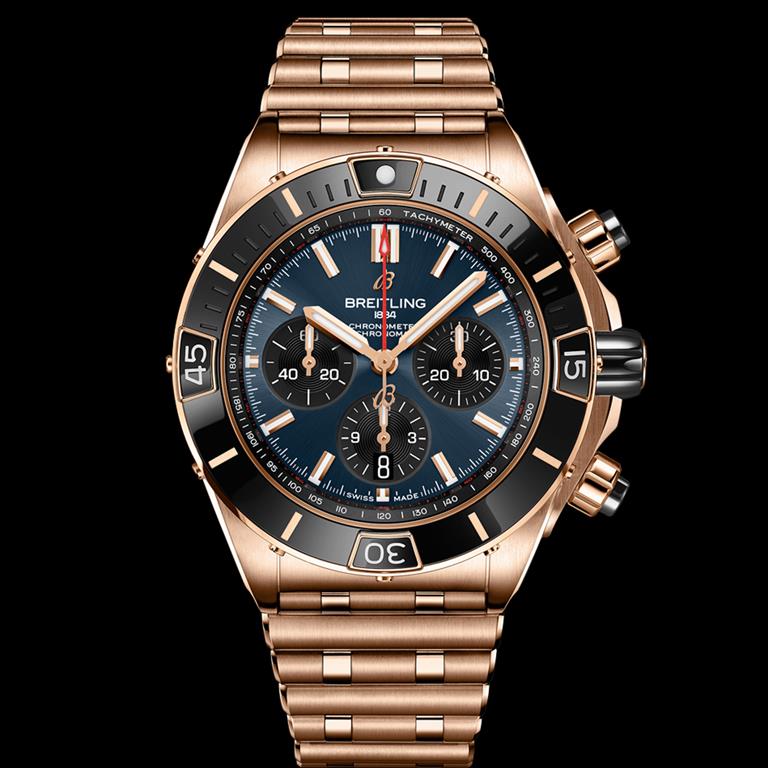 Super Chronomat, izdelan iz 18-karatnega rdečega zlata, ni lahka športna ura. Na ujemajoči se zapestnici Rouleaux tehta 330 gramov (samo ohiše 100 gramov), zato ne boste pozabili, da je ura na vašem zapestju. Če masa ni dovolj velik pokazatelj veličine časomera, potem 44 mm široko ter 14,4 mm debelo ohišje zagotovo je.
