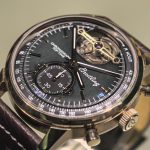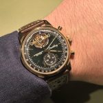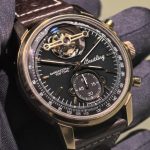 Linija Top Time je pred nekaj meseci postala bogatejša za komplikacijo avtomatskega tourbillon mehanizma s kronografsko poslastico. Prvič smo imeli moč to uro videti v živo – dotično model, ki je posvečen Fordu Mustangu (zelena številčnica). Bronasto ohišje v premer meri 43 mm, medtem ko se v osrčju nahaja avtomatski mehanizem, kaliber Breitling B21 s 55-urno zalogo energije navitja, katerega delovanje je moč ozreti skozi safirni kristal hrbtne strani ohišja.