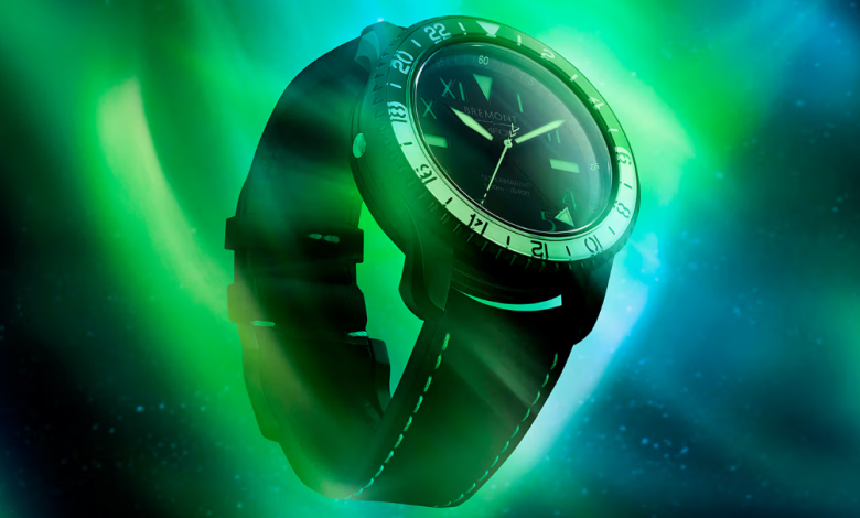 Zapestna ura Bremont Aurora, omejena na 500 kosov, izhaja iz kolekcije Supermarine, znane po svoji robustnosti in zanesljivosti. Ima 43-milimetrsko ohišje Trip-Tick iz nerjavečega jekla, prevlečeno z DLC, izboljšano z dvobarvno 24-urno luneto iz poliranega safirja za jasno indikacijo dneva in noči. Uro odlikujejo svetleče lastnosti, z zelenimi poudarki Super-LumiNova, ki odsevajo eterični sij Aurore Borealis. Posebni učinek je dosežen s prefinjeno “slojno” konstrukcijo številčnice, ki izboljša vidljivost in doda videzu ure očarljivo globino.