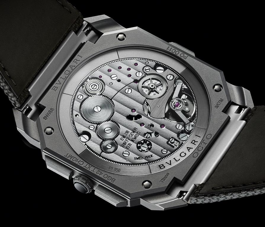 Skozi safirni hrbet ure lahko opazujemo hišni mehanizem BVL 318, ki v višino meri le 3,3 milimetra. Kljub temu omogoča do 55 ur rezerve navitja. Bulgari Octo Finissimo S Chronograph GMT bo na voljo letos poleti po ceni 13.700 evrov.
