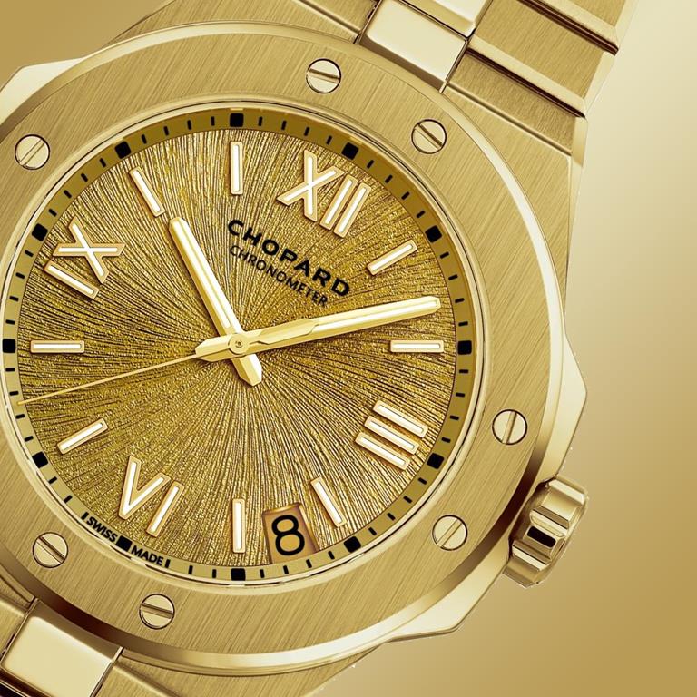 Čeprav smo to uro že videli v 18-karatnem rožnatem zlatu, je nekaj zelo privlačnega v rumenem zlatu, saj spomni na markantne moške ure iz osemdesetih let prejšnjega stoletja. Časomer je v celoti odet v rumeno zlato, vključno z vijaki na luneti. No, skoraj celoti, saj zaponka zapestnice ter njeni vijaki niso dobili zlatega treatmaja. Kar se tiče uporabljenega zlata, je le-to etično pridobljeno. Številčnica Alpine Eagle 41 je zagotovo glavna atrakcija, s teksturo, ki jo je navdihnila orlova šarenica. Za dopolnitev  maksimalnega zlatega izgleda, so na zlati številčnici še zlati kazalci ter zlata plošča z diskretnimi, črnimi številkami datuma.