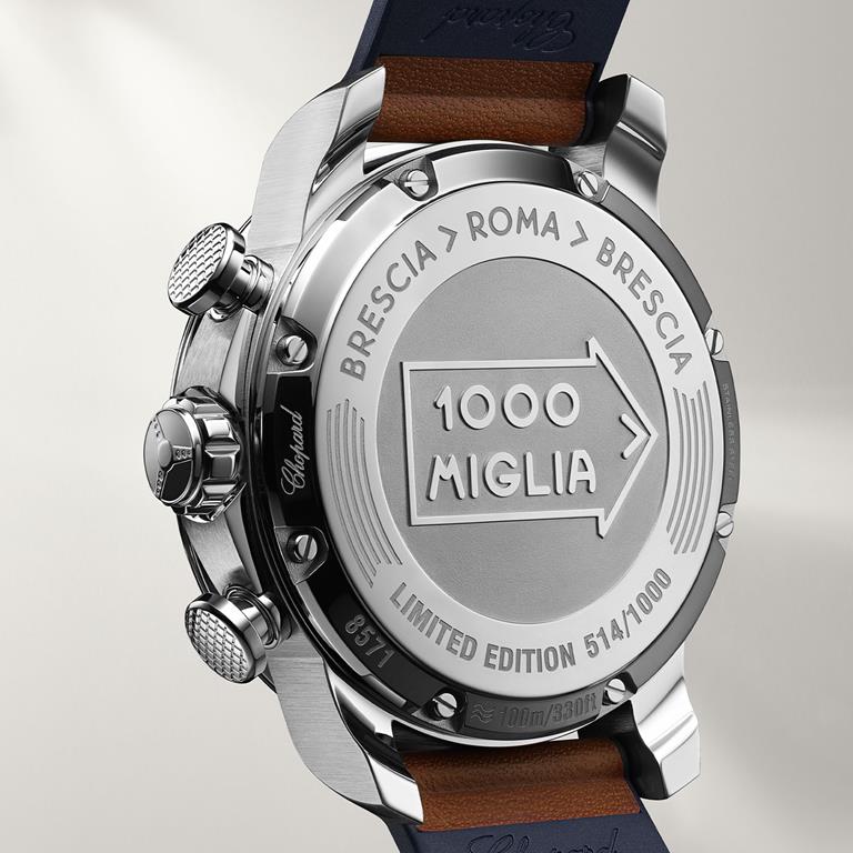 Ljubitelji bencinskih hlapov bodo pozdravili gumbe kronografa zasnovane v stilu ”batov” ter krono z odtisom volanskega obroča. Zadnjo stran ohišja obdaja pokrov z gravuro logotipa dirke ter številko ure iz omejene serije. Pri tem ne gre zanemariti, da ohišje omogoča do 100 metrov vodotesnosti. Na srebrni številčnici s krožno brušenimi vzorci v podštevičnicah izstopajo še kazalci in indikatorji z modro obrobo, rdeči barvni inserti na kazalcih ter logotip 1000 Miglia.
