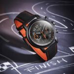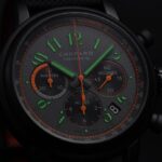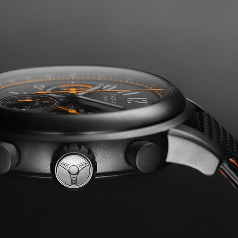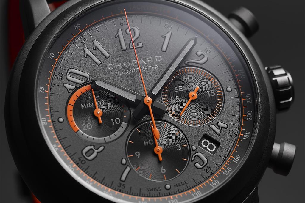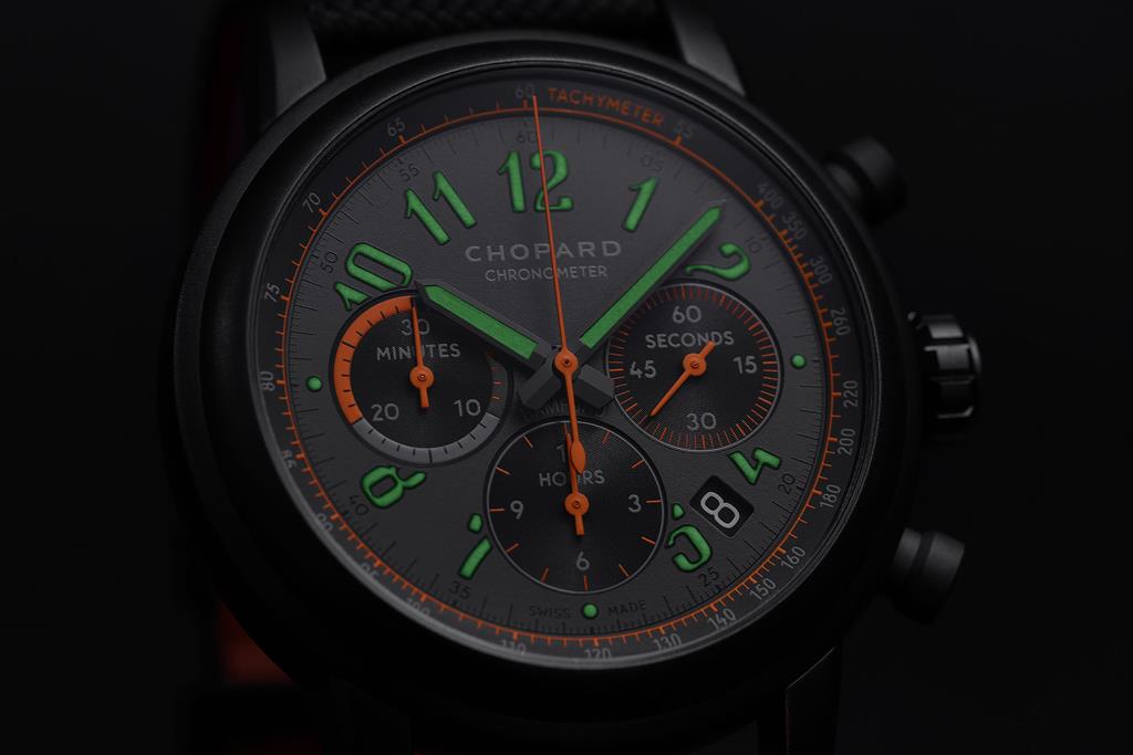 Bamford je ”klasičen kronograf” Mille Miglia pravzaprav obogatil s prezenco. Ta zdaj deluje bolj športno, k čemur botruje dejstvo, da je ohišje s premerom 42-milimetrov prevlečeno s temno sivim PVD ”filmom”. Nanos je tudi na kroni kot na gumboma za uporabljanje funkcije kronografa. Za kontrast poskrbijo oranžni detajli, katere najdemo na številčnici – tahimetrična skala, obrobe števcev kronografa ter sekundni kazalec, kot tudi na paščku, s katerega izstopajo oranžni šivi.