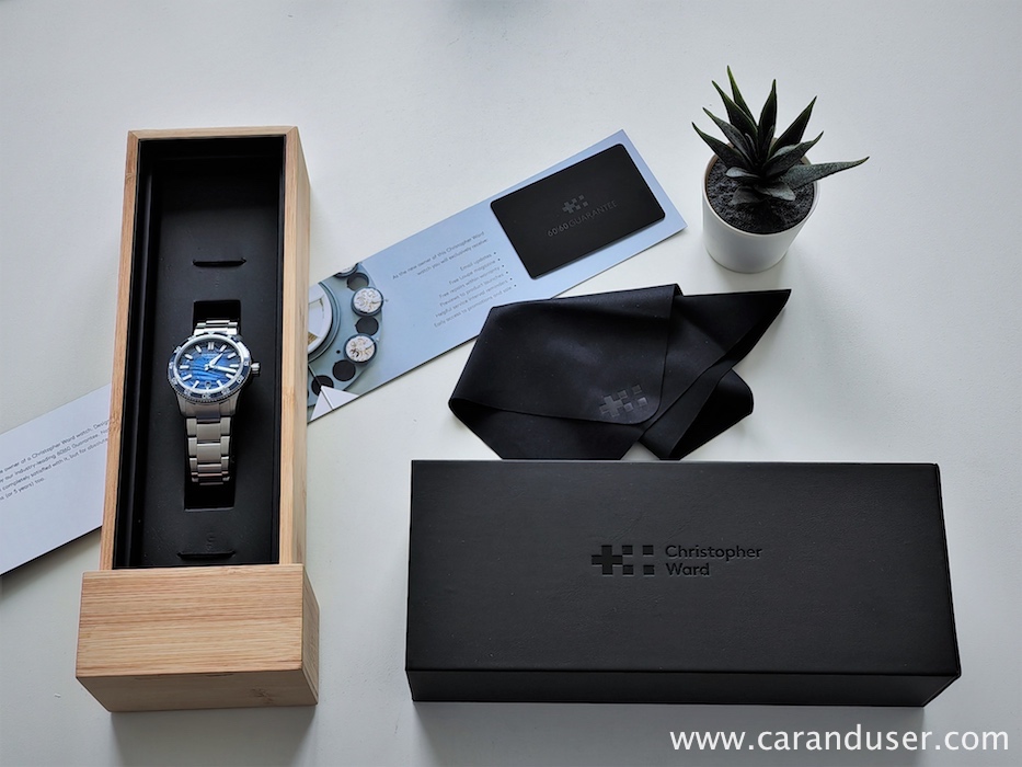 Christopher Ward ima tako kot vsak urar, dodobra razdelan portfelj in potapljaške ure sestavlja več kolekcij. Model C60 z oznako #tide je dvignil uredniške obrvi in po parih emailih s carinskimi dekleti, so ”potapljača” le spustili v deželo na južni strani Alp. Estestka embalaža s kombiancijo lesa in usnja skriva zajeten kos ure. Kar 190 g ”vaga” z jekleno zapestnico. In številčnica. Ta požanje vso pozornost, tako v prostoru, kot v sončnih žarkih … da ne omenjam svetilnosti luminiscence ob nastopu mraka.