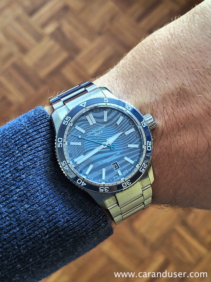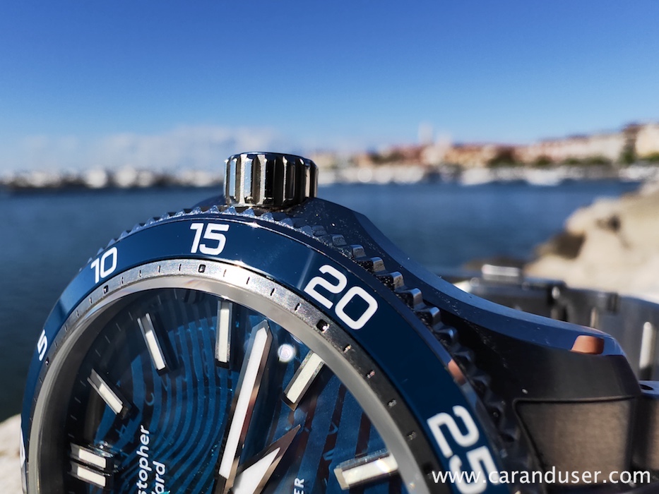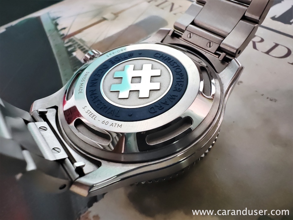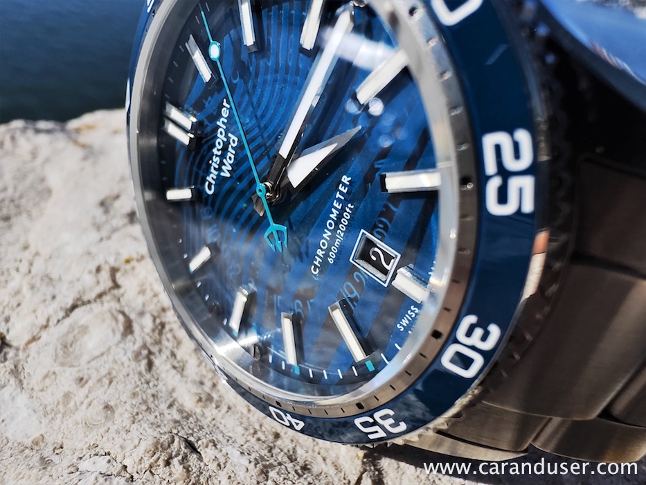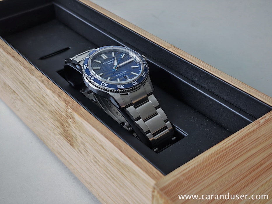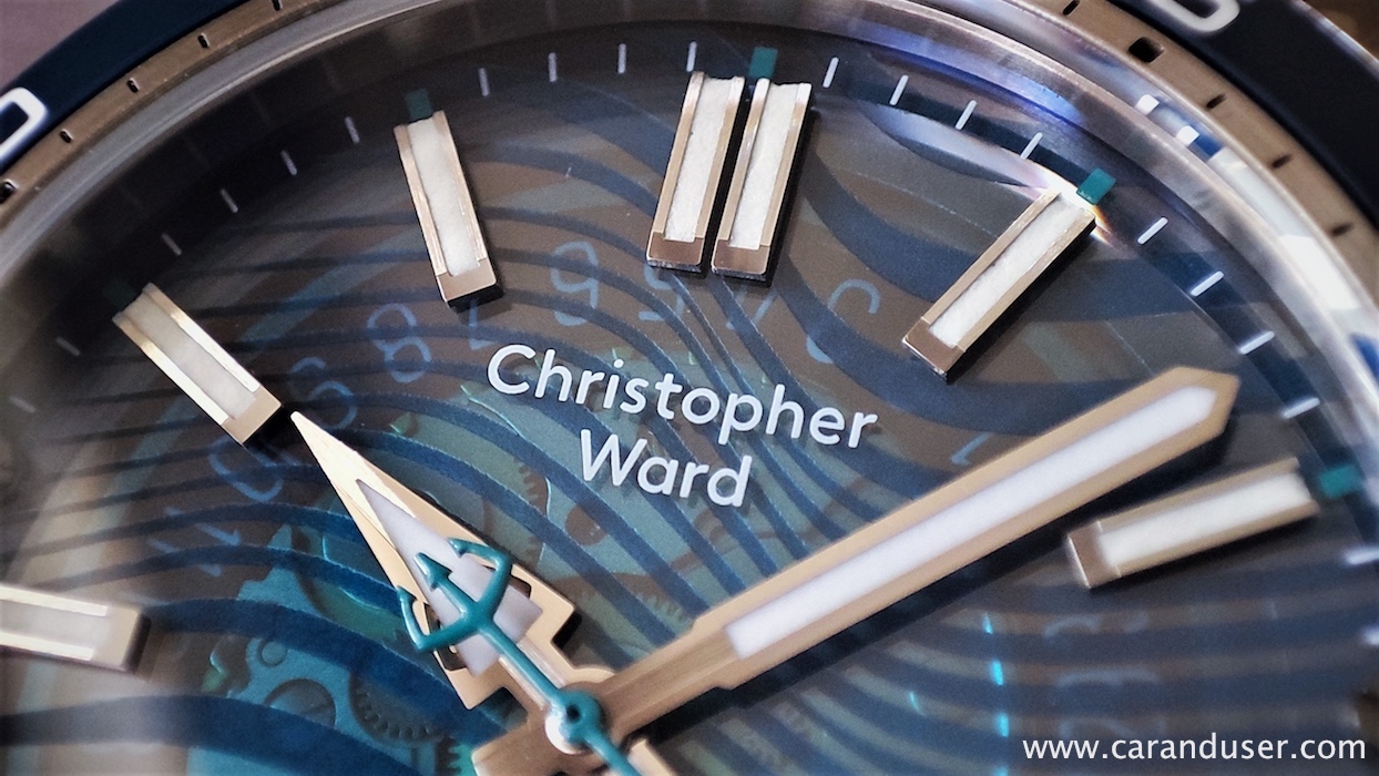 Christopher Ward ima tako kot vsak urar, dodobra razdelan portfelj in potapljaške ure sestavlja več kolekcij. Model C60 z oznako #tide je dvignil uredniške obrvi in po parih emailih s carinskimi dekleti, so ”potapljača” le spustili v deželo na južni strani Alp. Estestka embalaža s kombiancijo lesa in usnja skriva zajeten kos ure. Kar 190 g ”vaga” z jekleno zapestnico. In številčnica. Ta požanje vso pozornost, tako v prostoru, kot v sončnih žarkih … da ne omenjam svetilnosti luminiscence ob nastopu mraka.