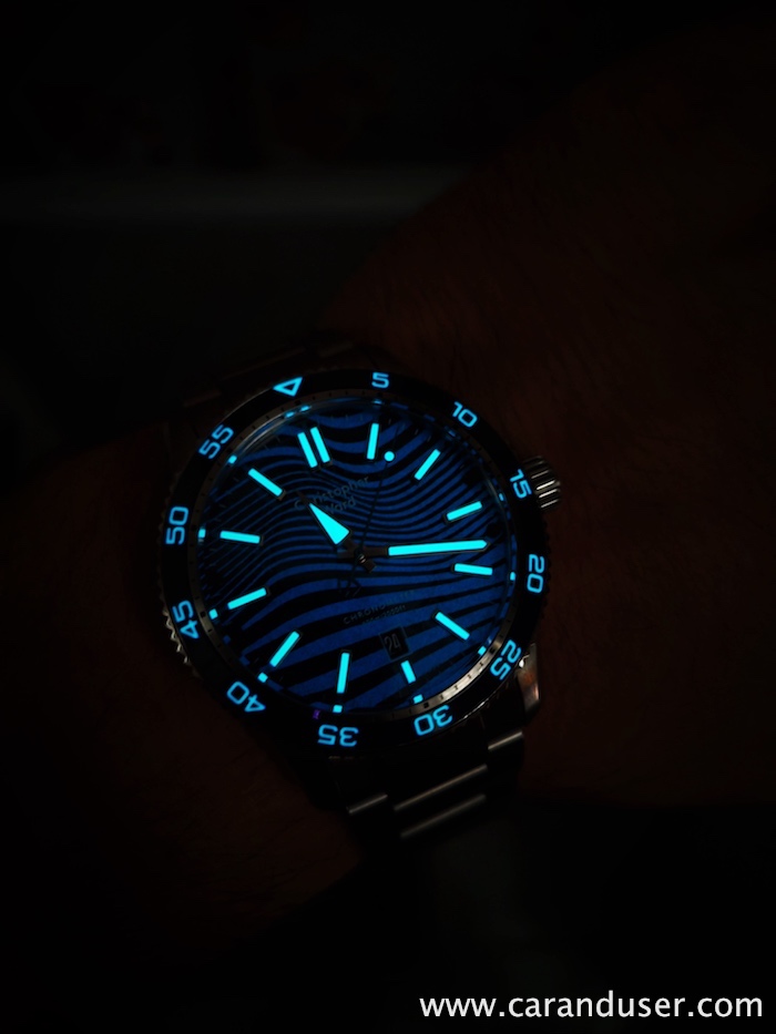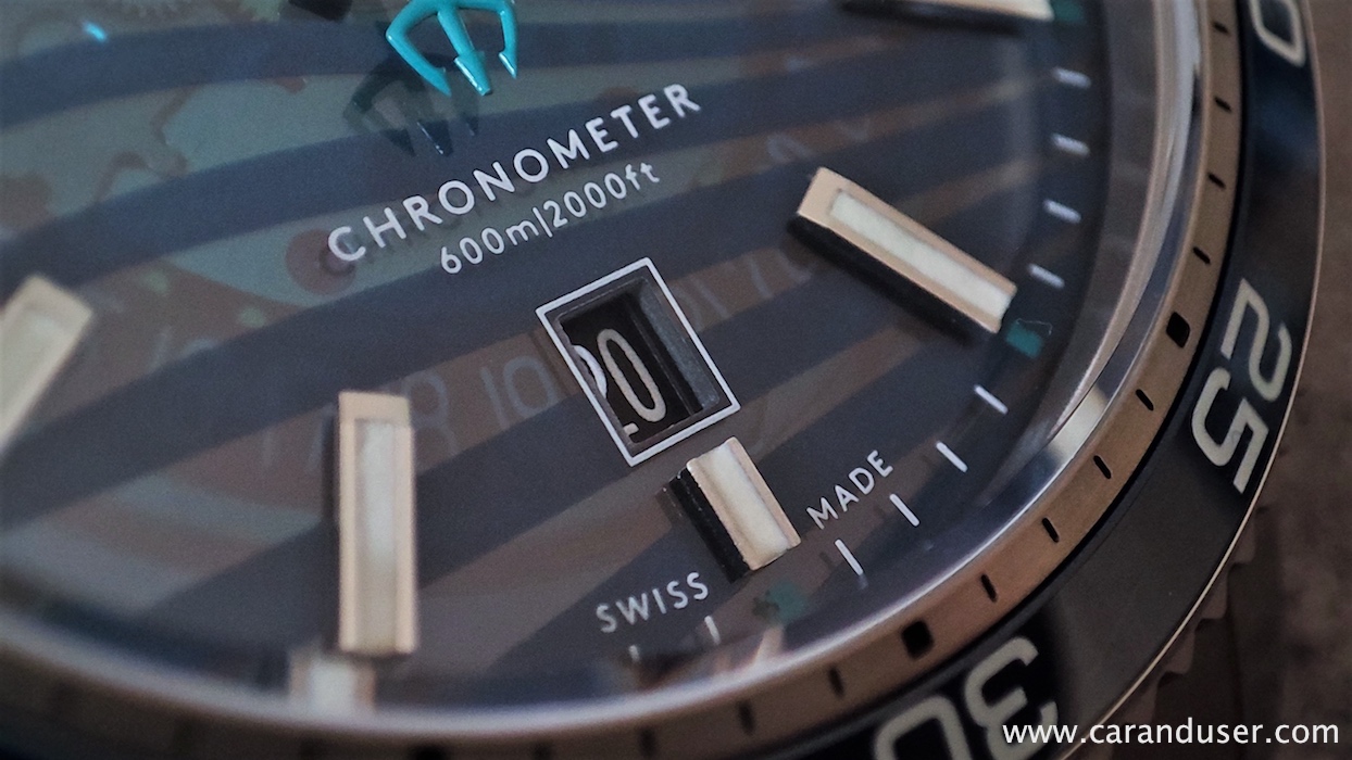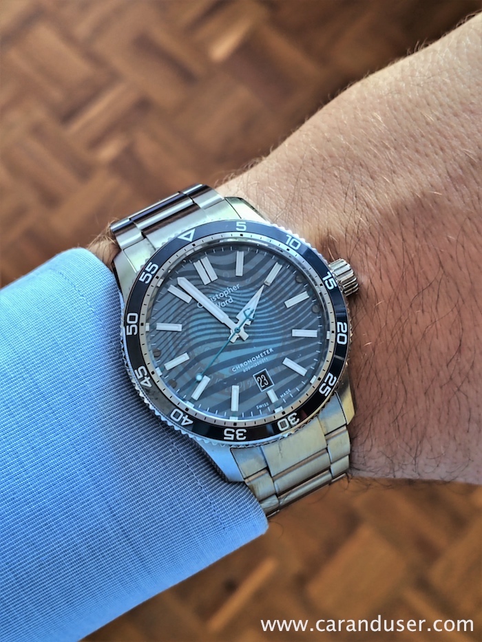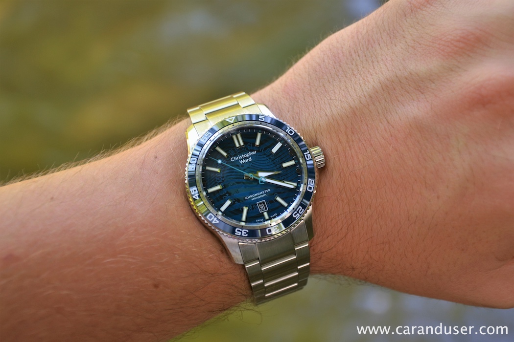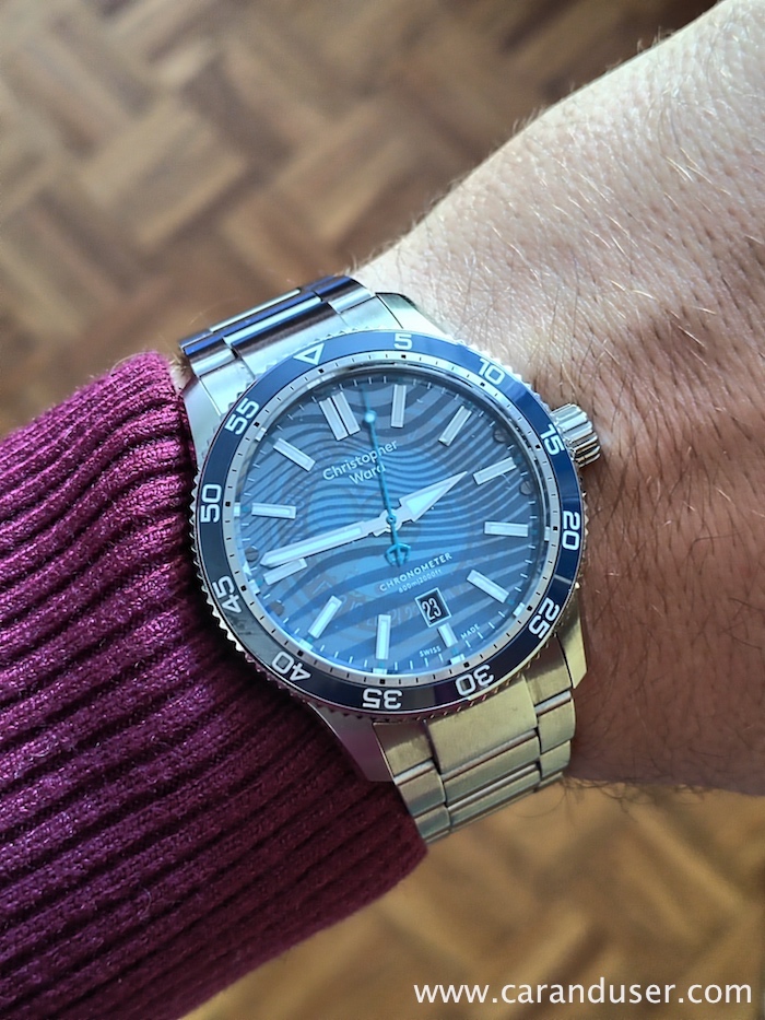 Christopher Ward ima tako kot vsak urar, dodobra razdelan portfelj in potapljaške ure sestavlja več kolekcij. Model C60 z oznako #tide je dvignil uredniške obrvi in po parih emailih s carinskimi dekleti, so ”potapljača” le spustili v deželo na južni strani Alp. Estestka embalaža s kombiancijo lesa in usnja skriva zajeten kos ure. Kar 190 g ”vaga” z jekleno zapestnico. In številčnica. Ta požanje vso pozornost, tako v prostoru, kot v sončnih žarkih … da ne omenjam svetilnosti luminiscence ob nastopu mraka.