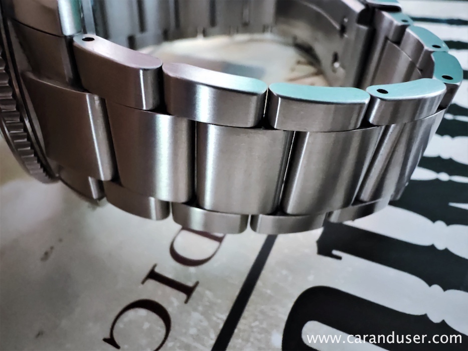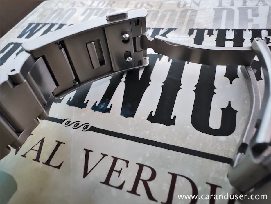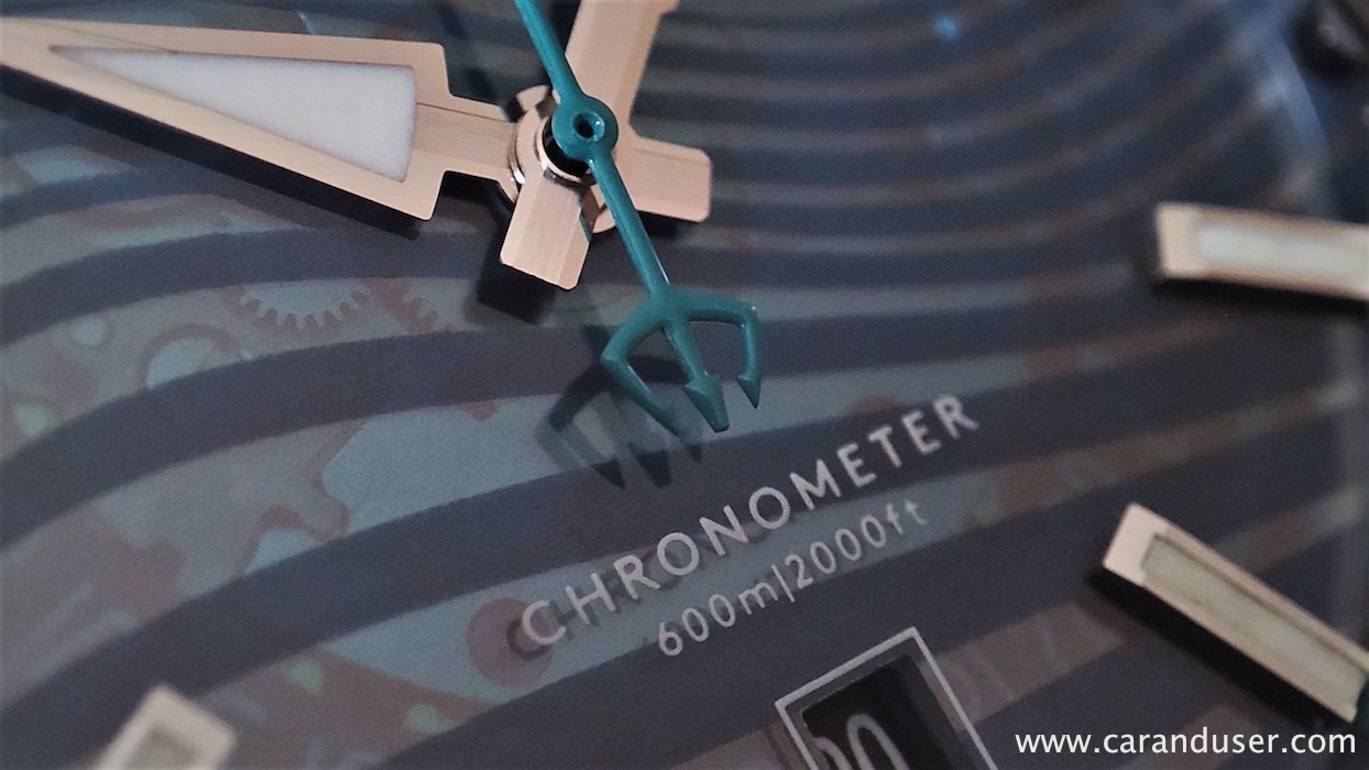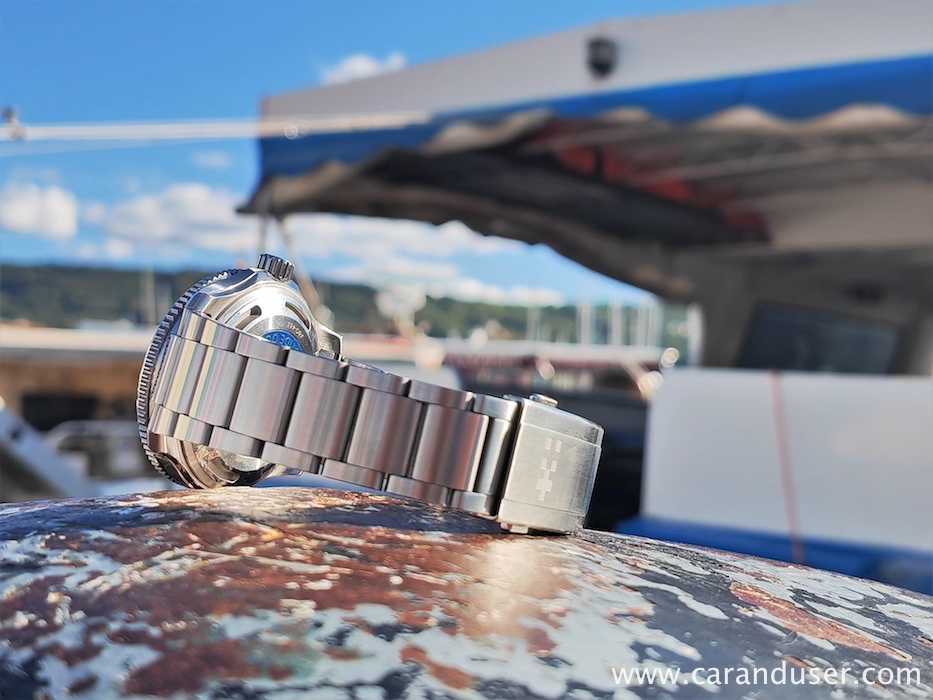 Ampak, če vam je vizualno všeč, si jo le naročite, saj jo lahko v nasprotnem primeru vrnete v 60 dneh. Čeprav dvomim da jo boste, saj ima ura toliko atributov, da ne vidim razloga, zakaj bi plačali več in dobili manj. S tem kažem na detajle kot je fini raztez jeklene zapestnice v zaponki, integriran sistem menjave paščkov, keramično luneto, prosojno modro steklo številčnice z vzorcem ”Miami” skozi katero se vidi delovanje mehanizma in še bi lahko našteval. Še beseda o mehanizmu, ki je delovna Sellita SW200, certificirana po COSC. Res da ima borih 38-ur zaloge energije navitja, vendar bo za dvakratnik zaloge energije potrebno odšteti vsaj 10 tisočakov, kateri pa še vedno ne bodo prinesli originalne luminiscence, sistema menjave paščkov …
