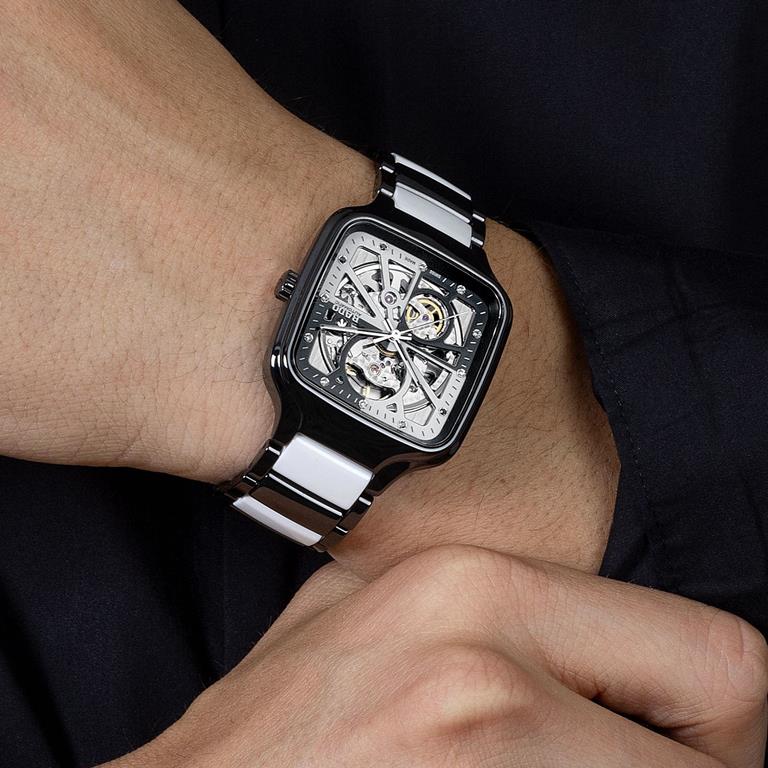 Potem nastane tole. Črno-beli duo True Square, ki ob velikosti ohišja 38 mm x 44,2 mm ohranja specifikacije originala. Posebnost je prezenca ohišja, ki je v osnovi lahko črna ali bela. S safirnim steklom zaščitena kvadratna številčnica je razdeljena na štiri območja.