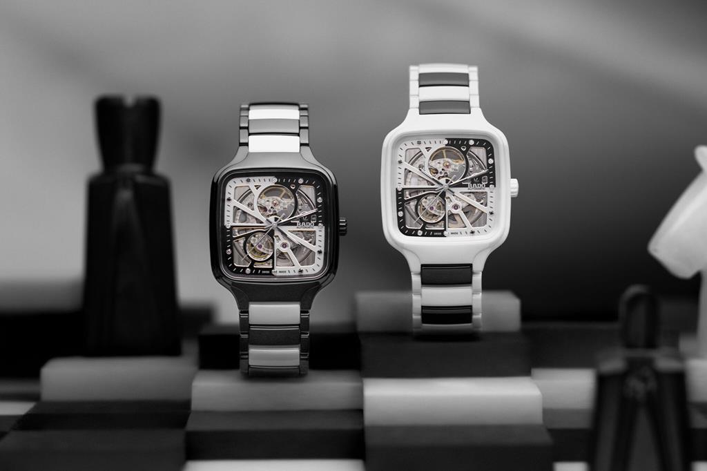 Potem nastane tole. Črno-beli duo True Square, ki ob velikosti ohišja 38 mm x 44,2 mm ohranja specifikacije originala. Posebnost je prezenca ohišja, ki je v osnovi lahko črna ali bela. S safirnim steklom zaščitena kvadratna številčnica je razdeljena na štiri območja.