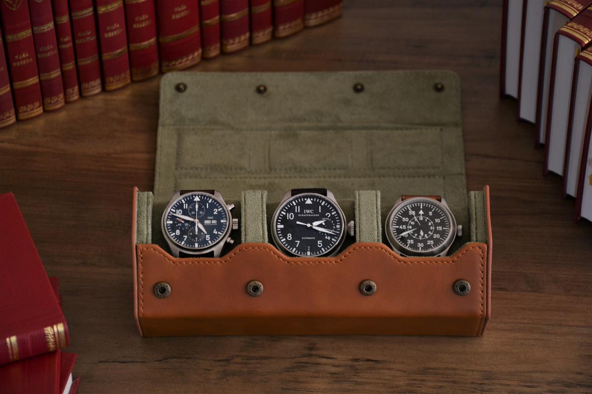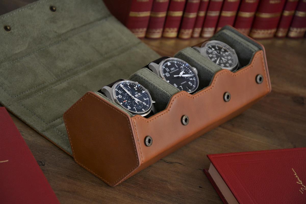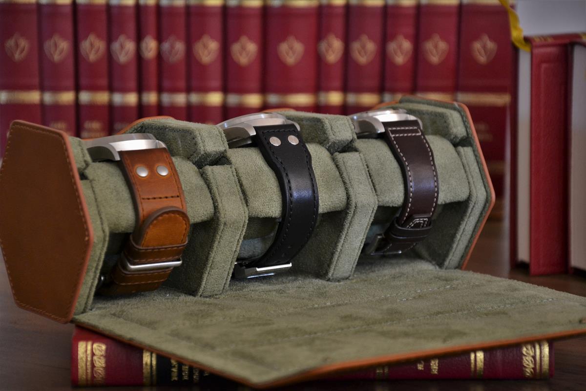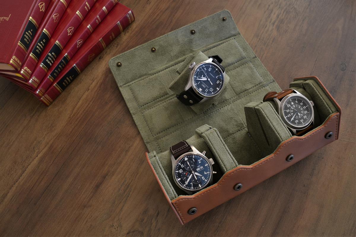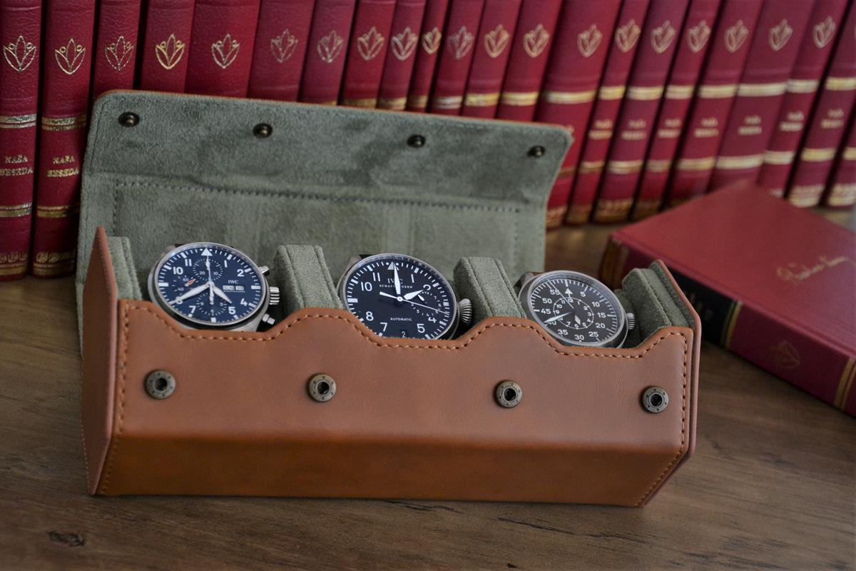 V mojem ožjem naboru so bile štiri ure in tri variacije. Zavitek za vse štiri ure, manjši zavitek z dvema mestoma za uri iste znamke ter zavitek za tri zapestne ure pilotskega tipa. In ker so v življenju najboljše stvari tri, sem se odločil za zadnjo kombinacijo. No, v bistvu, če sem iskren, sem naletel na čudovite role, ki so me kupile zaradi dveh stvari – šesterokotne oblike in rjavo-olivne barvne kombinacije. Nemudoma sem si v ”šatulji” vizualiziral svojo letalsko kolekcijo.