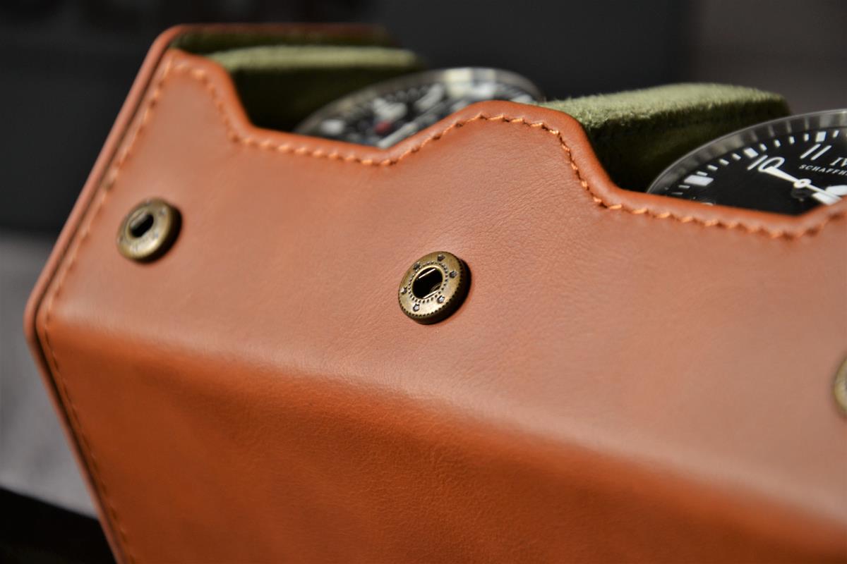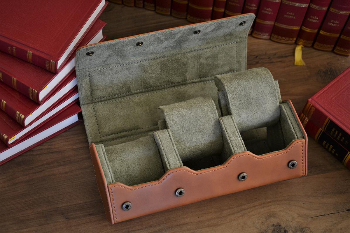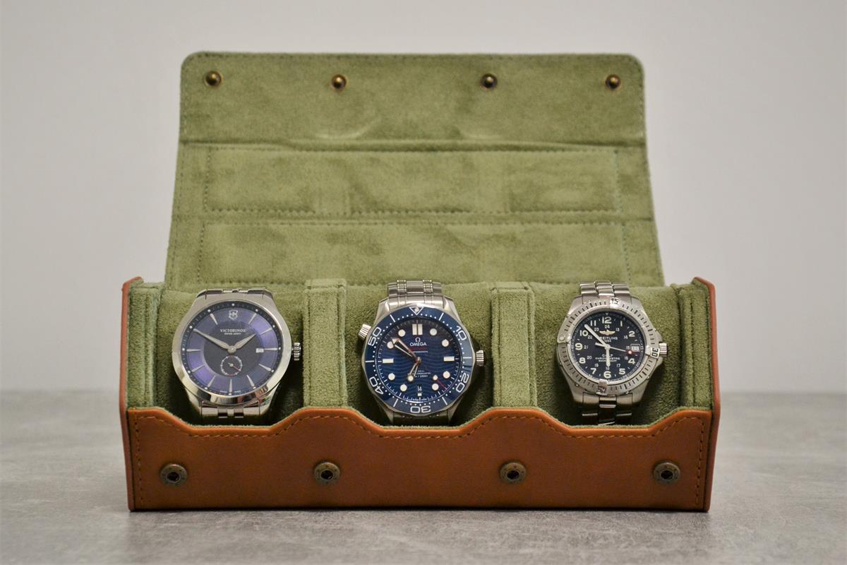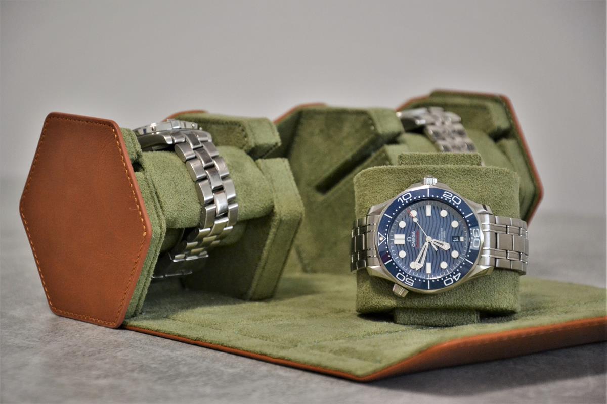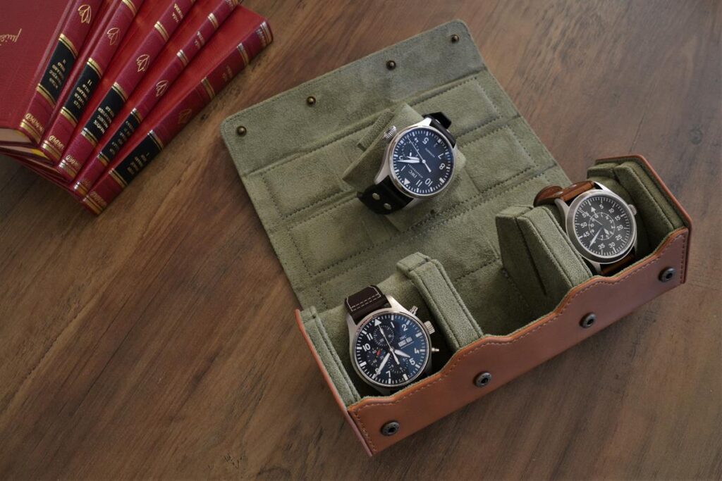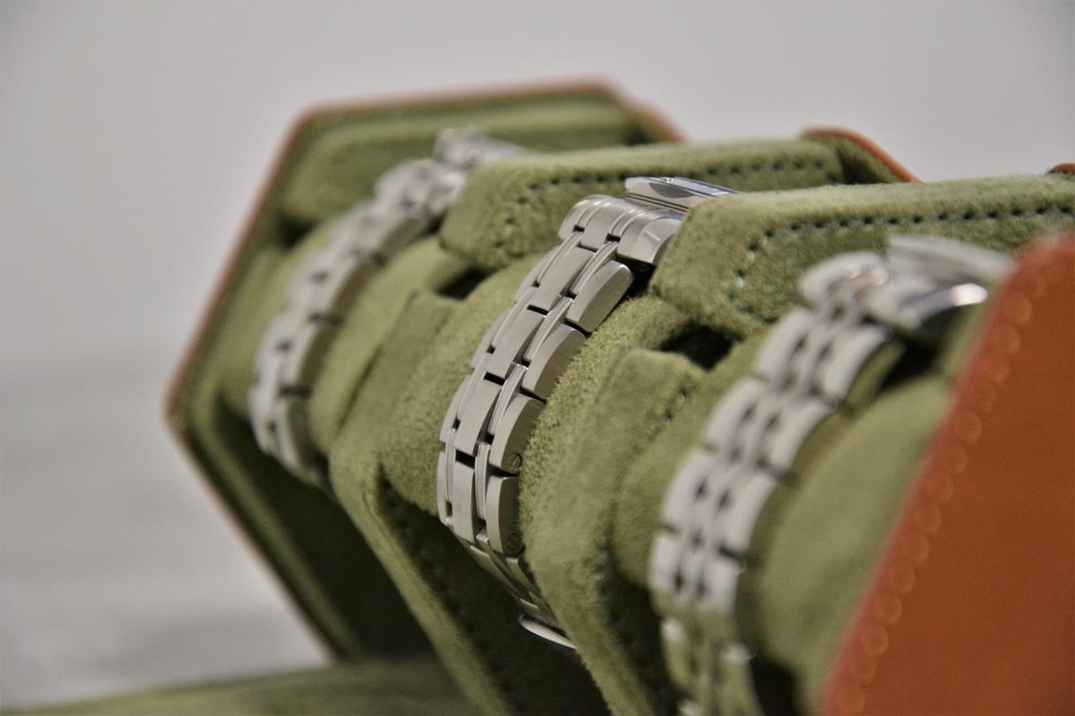 V mojem ožjem naboru so bile štiri ure in tri variacije. Zavitek za vse štiri ure, manjši zavitek z dvema mestoma za uri iste znamke ter zavitek za tri zapestne ure pilotskega tipa. In ker so v življenju najboljše stvari tri, sem se odločil za zadnjo kombinacijo. No, v bistvu, če sem iskren, sem naletel na čudovite role, ki so me kupile zaradi dveh stvari – šesterokotne oblike in rjavo-olivne barvne kombinacije. Nemudoma sem si v ”šatulji” vizualiziral svojo letalsko kolekcijo.