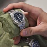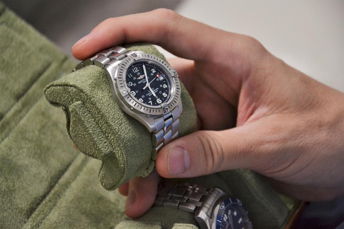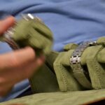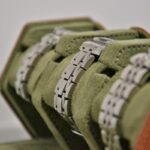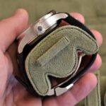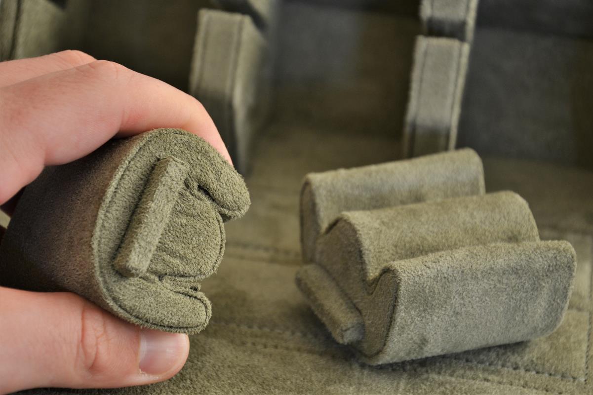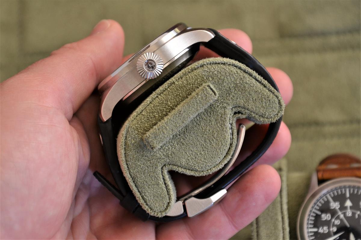 Še ena pozitivna stran blazinice. Ta je široka dobrih 5 centimetrov, kar pomeni, da se nanjo dobro uleže tudi zajetnejša ura kakršna je IWC Big Pilot. Poleg tega pa se blazinica, zaradi svoje M oblike stisne, ter s tem omogoči namestitev ure brez da bi bilo potrebno raztegniti zapestnico ali odpeti usnjeni pašček.