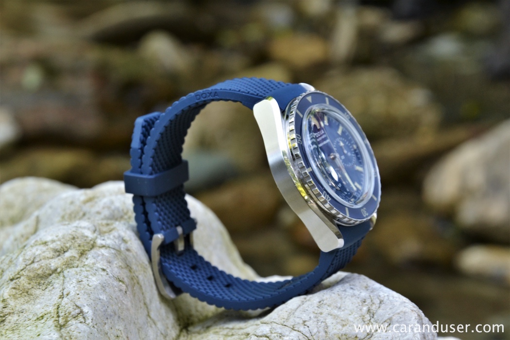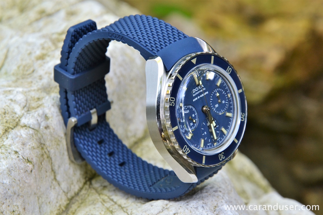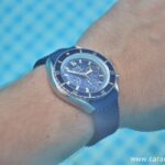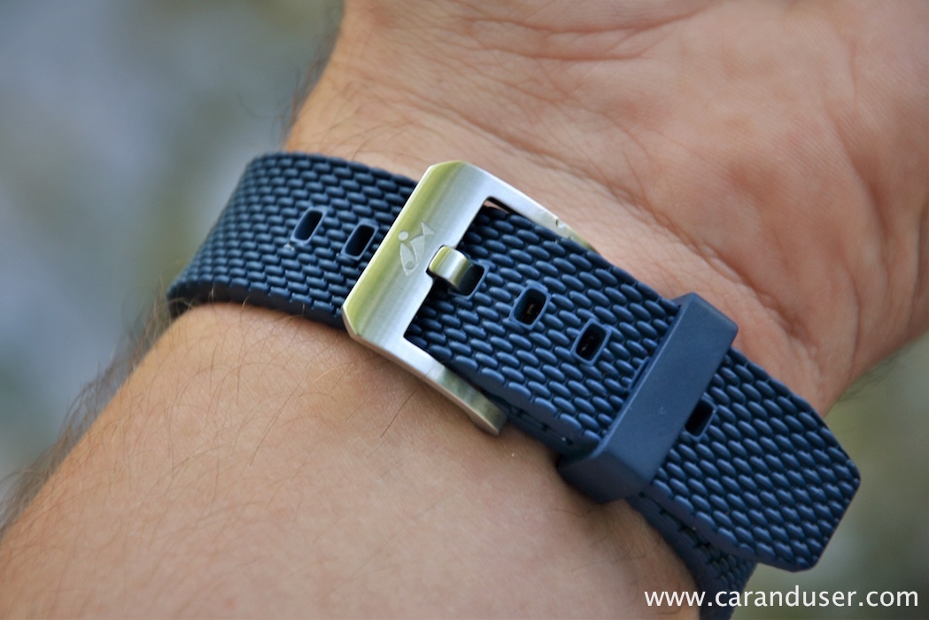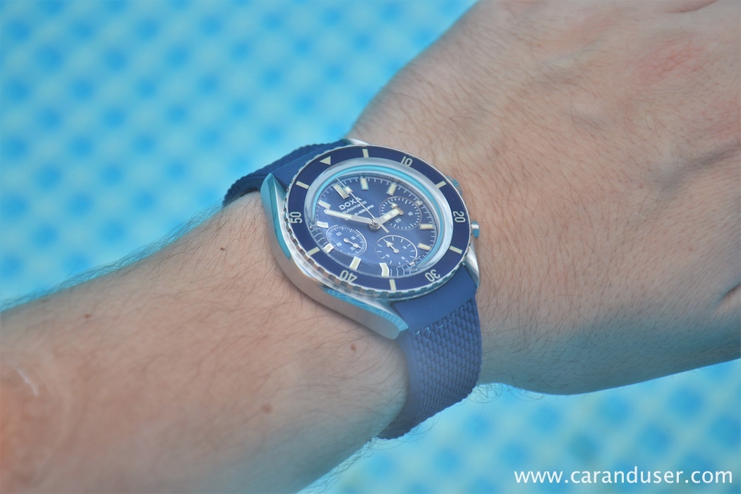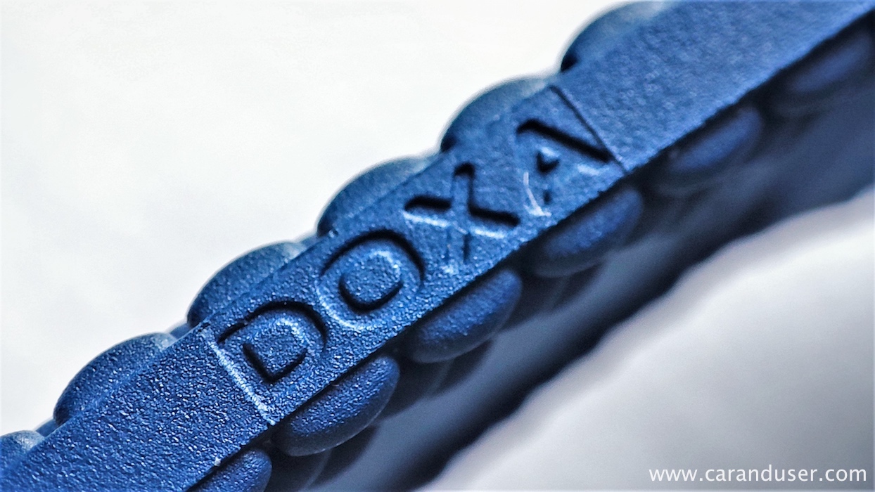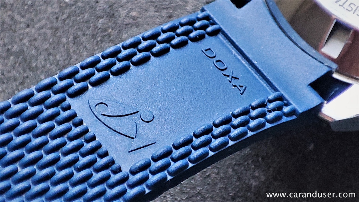 Proporcem potapljaške ure nimam kaj dosti očitati, saj dobro sede na zapestje in kljub svoji veličini, ob premikanju roke med opravili ohišje ne prevaga z vrha zapestja. Slednje je pogost pojav, kadar ohišje obdaja lahkoten pašček, kot je tale preizkusni iz kavčuka. Ampak, v dotičnem primeru temno moder FKM gumijast pašček s teksturo riževih zrn ter zaponko s simbolom ribe Doxa pripomore k dobremu prileganju različnim obsegom zapestij. Tako ura deluje suvereno na zapestju premera 20 centimetrov, kakršno je moje, ter vse tja do 15 centimetrov, saj zavoljo kratkih ”ušes” oziroma nastavkov za pašček na manjšem zapestju ne deluje ravno kot stenska ura.