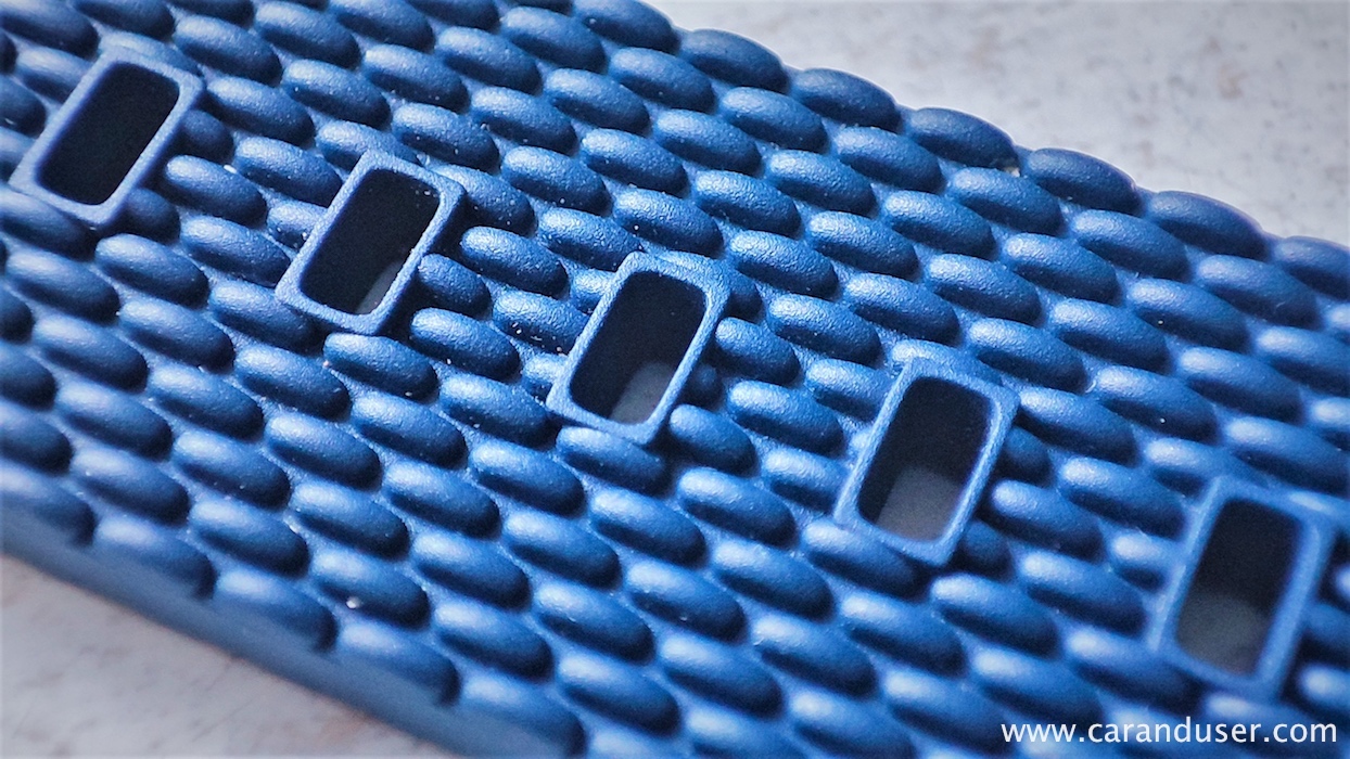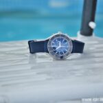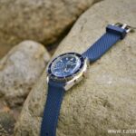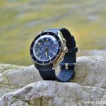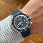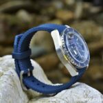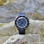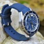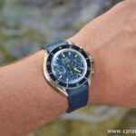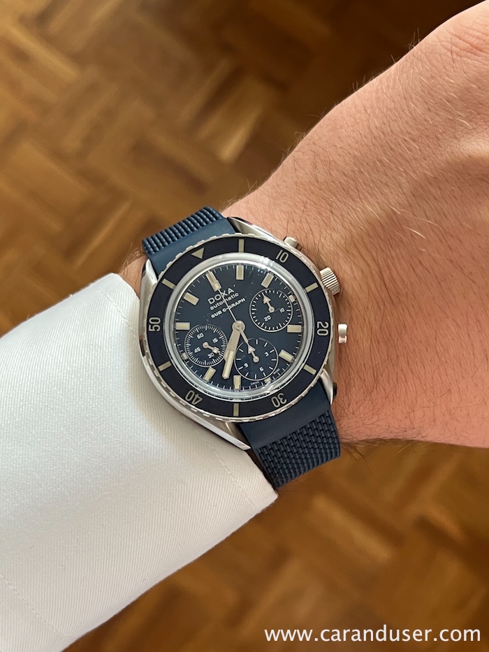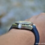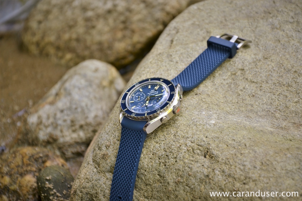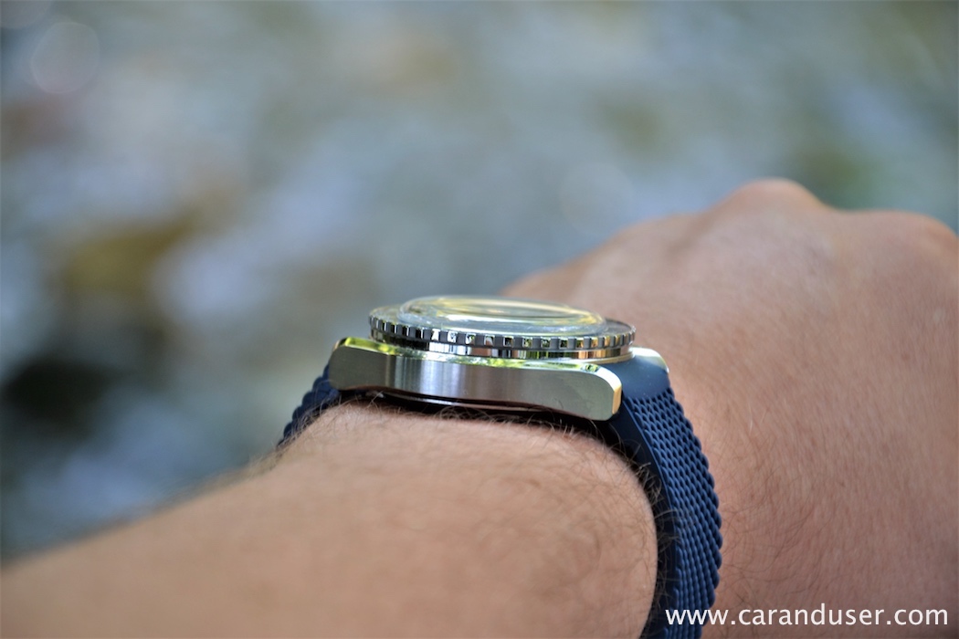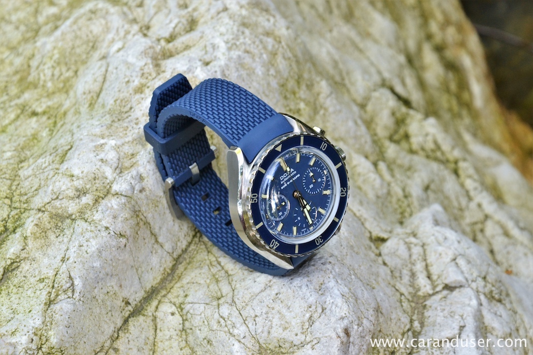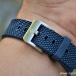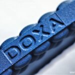 Proporcem potapljaške ure nimam kaj dosti očitati, saj dobro sede na zapestje in kljub svoji veličini, ob premikanju roke med opravili ohišje ne prevaga z vrha zapestja. Slednje je pogost pojav, kadar ohišje obdaja lahkoten pašček, kot je tale preizkusni iz kavčuka. Ampak, v dotičnem primeru temno moder FKM gumijast pašček s teksturo riževih zrn ter zaponko s simbolom ribe Doxa pripomore k dobremu prileganju različnim obsegom zapestij. Tako ura deluje suvereno na zapestju premera 20 centimetrov, kakršno je moje, ter vse tja do 15 centimetrov, saj zavoljo kratkih ”ušes” oziroma nastavkov za pašček na manjšem zapestju ne deluje ravno kot stenska ura.