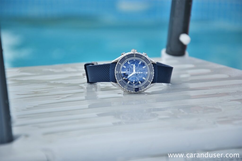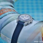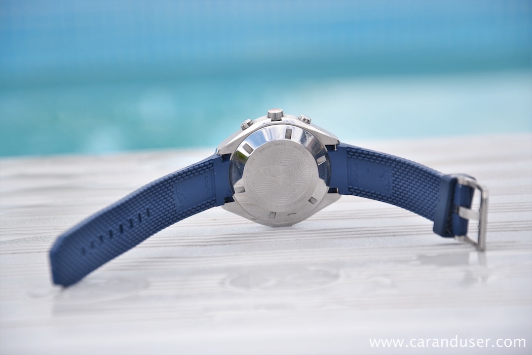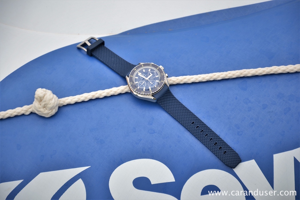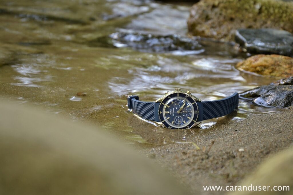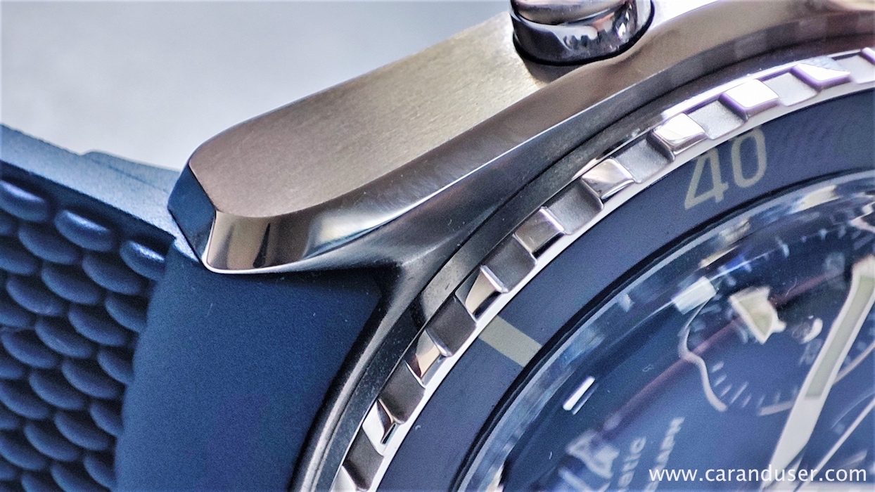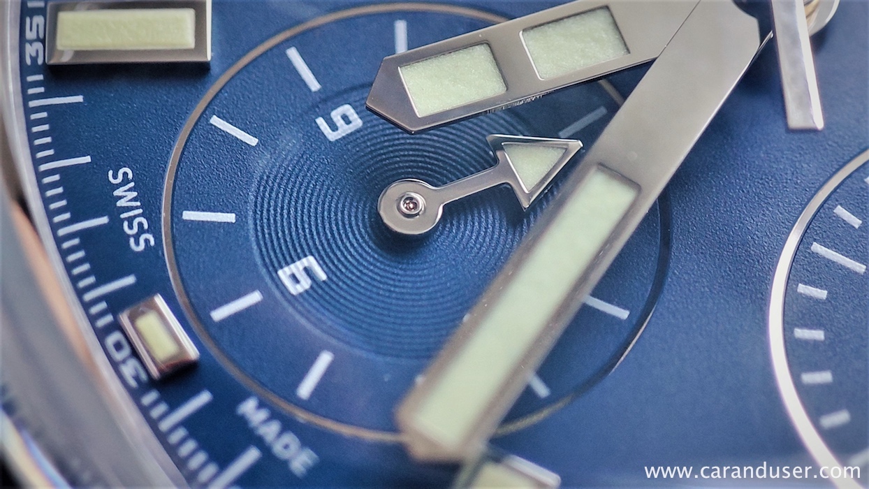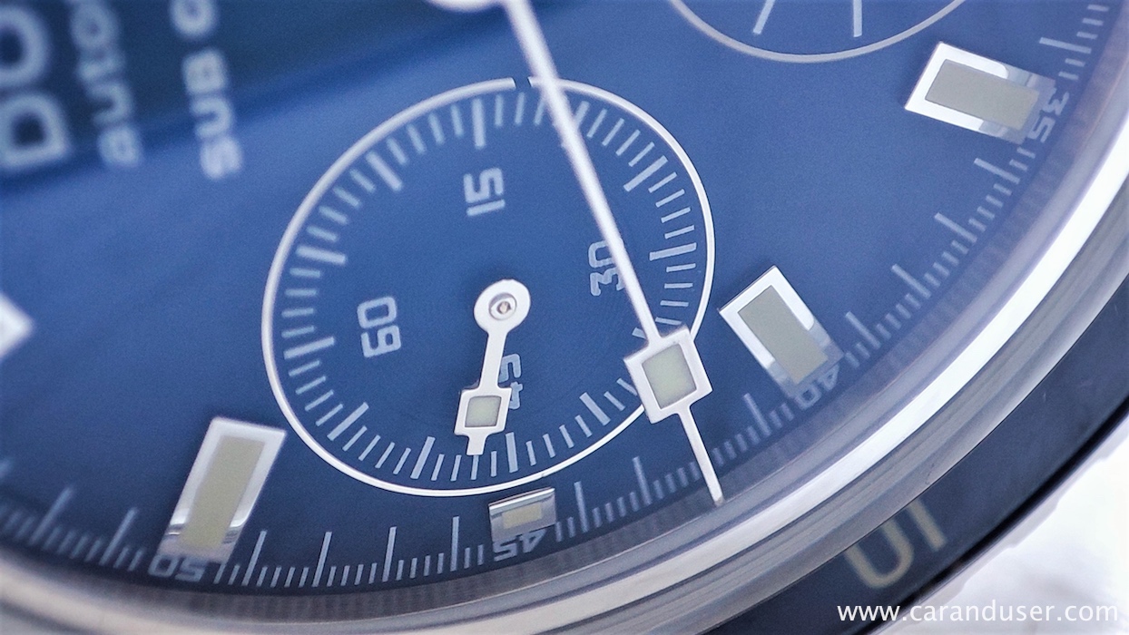 Navduši temno modra številčnica s tri-compax postavitvijo podštevilčnic kronografa, ki s kromom obdanimi kremnimi indikatorji ur kot kazalci ustvari pridih potapljaških časomerov iz 50. let prejšnjega stoletja. Krem barva je v bistvu ustvarjena od luminiscenčnega materiala, s katerim je vse skupaj prevlečeno, vključno s 60-minutno skalo na luneti. Slednja se ponaša z modrim keramičnim vložkom ter 120 točkovnim enosmernim vrtenjem.