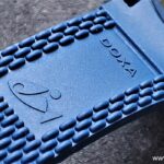 | Pas | Temno moder FKM gumijast pašček s teksturo riževih zrn ter zaponko s simbolom ribe DOXA; sistem menjave paščkov; širina 20 mm |