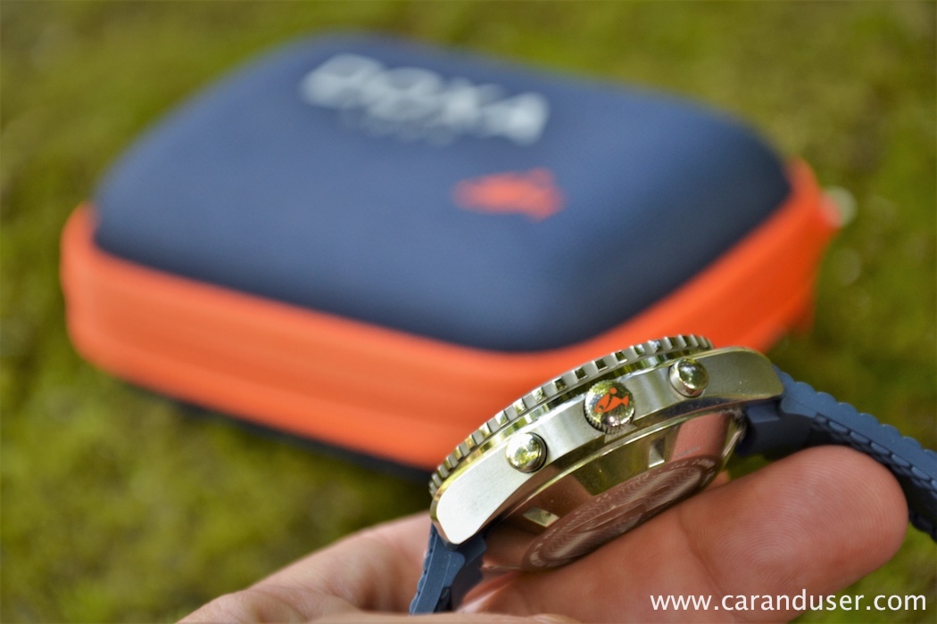Potapljaško uro poganja predelan velikoserijski avtomatski mehanizem, ki se pohvali s solidno 56-urno zalogo energije navitja, kar povsem zadostuje, če za kakšen dan na dopustu snamemo uro z zapestja in jo postavimo v priročno šatuljo, s katero je uro dostavljena.