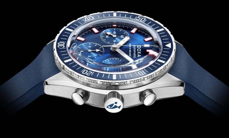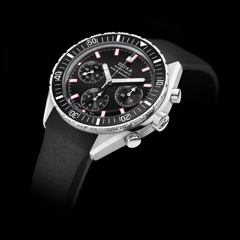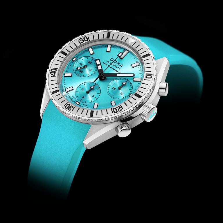 Znotraj ohišja se Doxa še vedno zanaša na mehanizem Sellita SW510 – klon modela 7753. Ta robusten avtomatski kronograf bije pri 4 Hz in hrani do 56 ur rezerve energije navitja. Doxa po novem prepušča izbiro med značilno zapestnico iz nerjavečega jekla “beads of rice” z zložljivo zaponko in potapljaškim podaljškom ali paščkom iz gume FKM, ki se ujema z izbrano barvo številčnice.