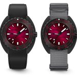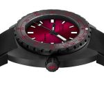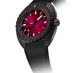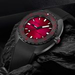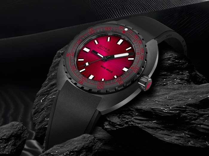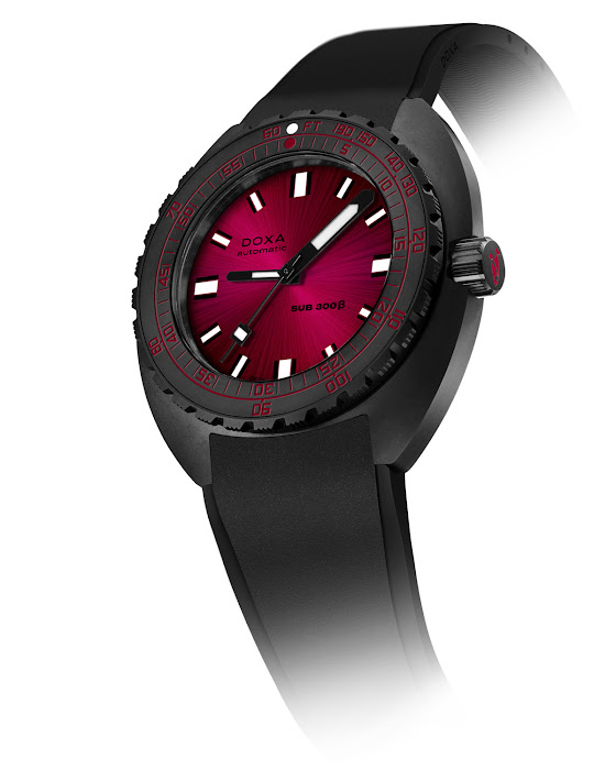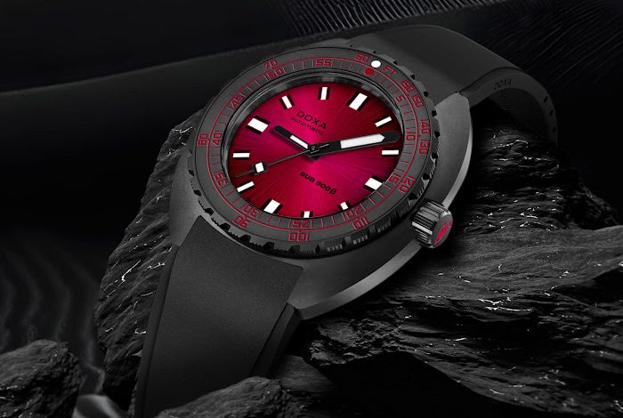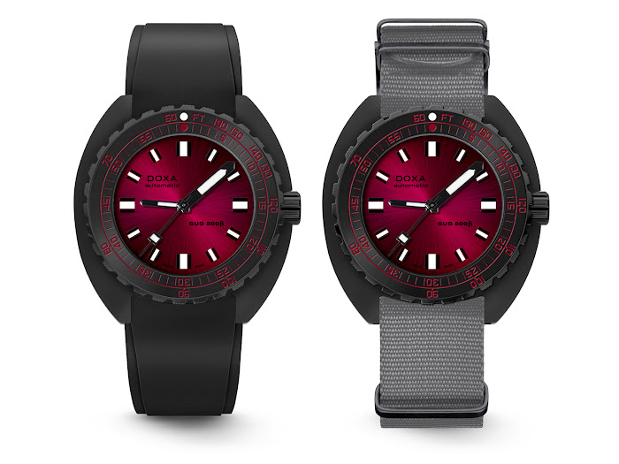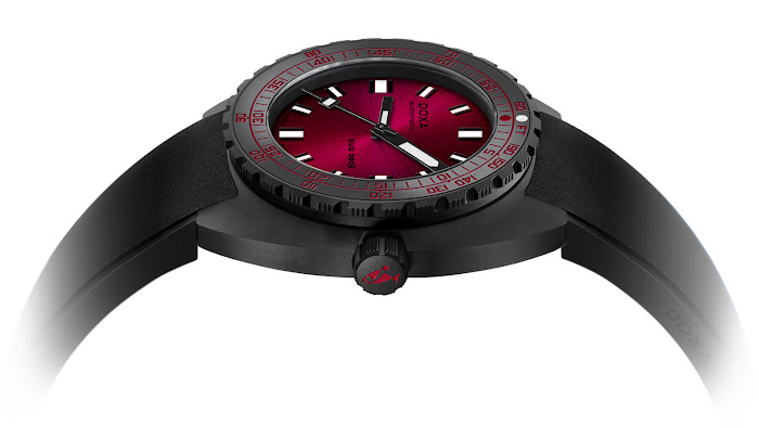 Za to posebno izdajo Doxa združuje mat črno keramično ohišje s češnjevo rdečo številčnico, ki se igra s svetlobo zavoljo teksture v stilu sončnih žarkov. Gre za izrazit kontrast s črnimi kazalci in indeksi, ki so bogato napolnjeni z belo Super-LumiNovo. Patentirana enosmerna vrtljiva luneta z dvojno indikacijo časa potapljanja, vgravirana v ton v tonu češnjevo rdeče barve, podaljšuje barvo številčnice in hkrati poudarja športni značaj ure.