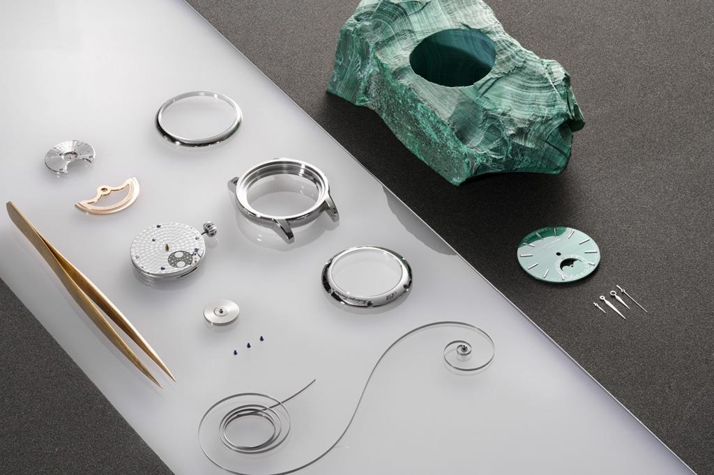 Malahit je bil pred nekaj leti zelo priljubljen material za številčnice, saj ustvari čudovito teksturo, medtem ko je sleherna referenca pravzaprav unikat. Za nameček je proizvajalec popolonma prevetril postavitev številčnice modela Classic Moonphase Date. Zapleta prikaza dneva kot faze men sta ob 6. uri, brez razlike v nivojih, kar zagotavlja več prostora za malahit. Posodobljene so še oznake ur in kazalci.