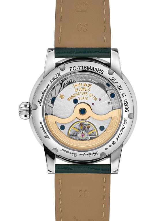 Poimenovanja omejene izdaje ima svoj namen, saj bo izdelanih samo 36 ur primerkov Frederique Constant Classic Moonphase Date Manufacture Poleg tega malahitna številčnica in zlato ohišje pomenita, da ima ceno 30.890 evrov, čeprav bo za večino ljubiteljev časomerov več konteksta imela neoštevilčena izdaja v jeklenem ohišju (seveda z novim mehanizmom) po ceni 4.150 evrov.