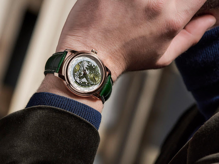 Specifikacije ostajajo nespremenjene, zato bo za občutek še kako prav prišel zapis našega nedavnega preizkusa ure Classic Worldtimer Manufacture (dodaj link testa). Zdaj že prepoznavno, je na številčnici reliefno upodobljen zemljevid sveta. Zunanji disk s polnimi imeni vseh 24 referenčnih mest je združen s 24-urnim diskom, razdeljenim na svetlejši del, ki označuje dnevni čas, in temno zeleno polovico za nočni čas. Ob 6. uri se nahaja prikaz datuma v retrogradnem stilu. Zanimivost časomera pa je ta, da se vse funkcije nastavljajo le s krono v obliki čebulice.