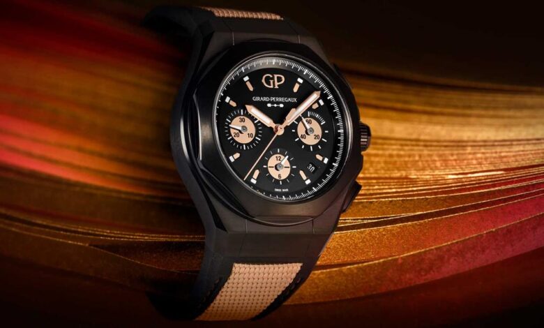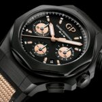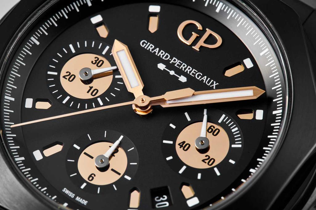 Že od nekdaj Girard Perregaux rad združuje skorajda nezdružljive reči – nastopaški dizajn z vsestransko uporabnostjo – tokrat še s kopico dodatkov iz rožnatega zlata. Ohišje krojeno iz titana in premerom 44 milimetrov se ponaša črnim PVD nanosom, ki ustvari svojevrsten kontrast z ravnimi in krožnimi satenastimi zaključki ter poliranimi robovi.