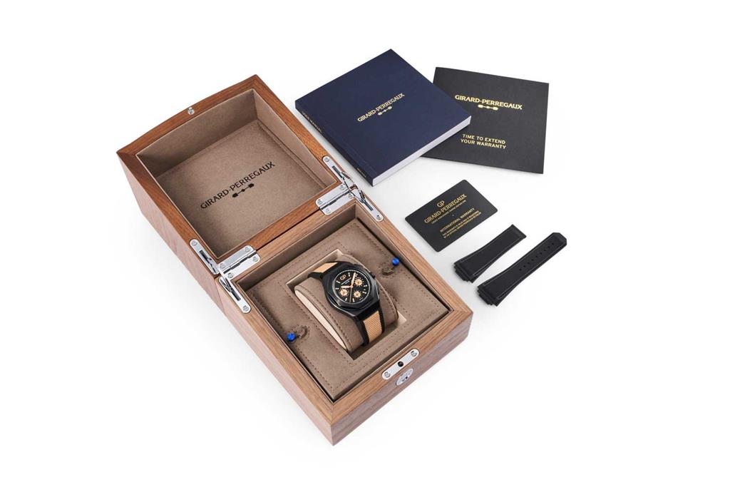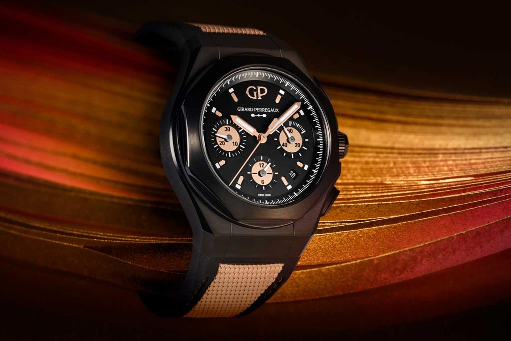 Že od nekdaj Girard Perregaux rad združuje skorajda nezdružljive reči – nastopaški dizajn z vsestransko uporabnostjo – tokrat še s kopico dodatkov iz rožnatega zlata. Ohišje krojeno iz titana in premerom 44 milimetrov se ponaša črnim PVD nanosom, ki ustvari svojevrsten kontrast z ravnimi in krožnimi satenastimi zaključki ter poliranimi robovi.