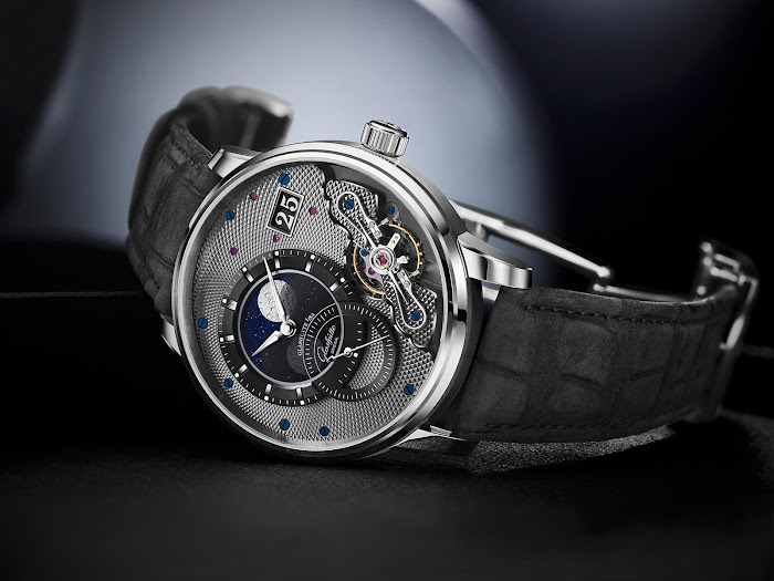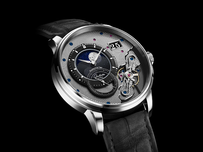 Ko preide skozi izrezan del številčnice, luna nadaljuje svojo orbito in je še vedno vidna pod sivomodrim safirnim kristalom, katerega prosojna površina omogoča stalen pogled na dva lunina diska. Ta fascinantni zaplet obkroža prikazovalnik ur in minut, ki ima aplicirane indekse in z diamanti brušene kazalce iz belega zlata.