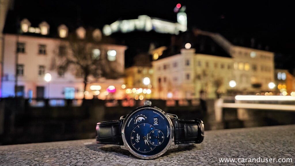 Med pogovorom urarske tematike sem pomislil na nedavno preizkušeno, idealno za njegovo zapestje. Petična, skrbno izdelana, mehansko popolna in elegantnega videza, ki nalašč ustreza življenjskemu stilu ljubitelja romantike mehanskih ur. Izvlečem telefon in pokažem fotografijo testne ure Glashütte Original PanomaticLunar. ”Poezija”, doda in nadaljuje: ”Poznam to nemško blagovno znamko. Vrhunske ure izdeluje. Škoda, da se vedno pri nakupu odločimo za klišeje. Mogoče jo kdaj postavim v svojo vitrino.”