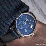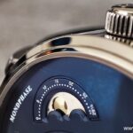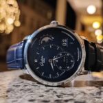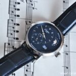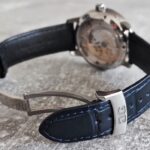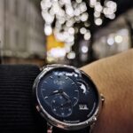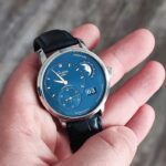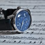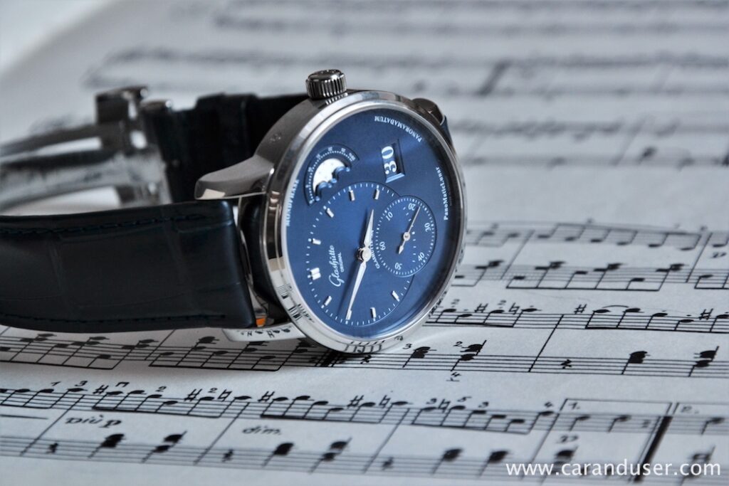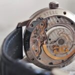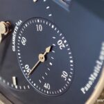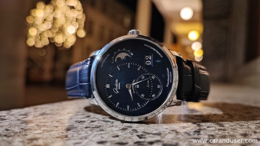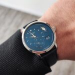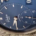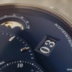Oblika torej spomina na vintage žepno ura, vendar na tem mestu se podobnost konča. Številčnica pompozno nastopa s svojo asimetrično postavitvijo, katera je nemško natančno preračunana z razdaljami med elementi. Koncept verjetno poznate s sosednje vaške manufakture, ampak dvomim, da v tem primeru govorimo o konkurenčnosti. Vsaka številčnica ima svojevrsten šarm in PanoMatic Lunar s temno modro galvanizirano številčnico preverjeno nikogar ne bo pustil ravnodušnega. Podlaga prikaza časa in sekund ima teksturo gramofonske plošče in prelivajočo se barvo z učinkom sončnih žarkov. Luminiscenca se nahaja le v kazalcema ur in minut, kar je dovolj, saj takšne ure praviloma redkeje nadenemo ter so bolj namenjene občudovanju kot branju natančnega časa. Skratka, na mestu 4. ure klasične številčnice se nahaja hišni patent prikaza datuma PanoramaDate, ki deluje s pomočjo dveh diskov. Prvi ali levi nosi številke od 0 do 3, medtem ko desni prikazuje cifre od 1 do 9.